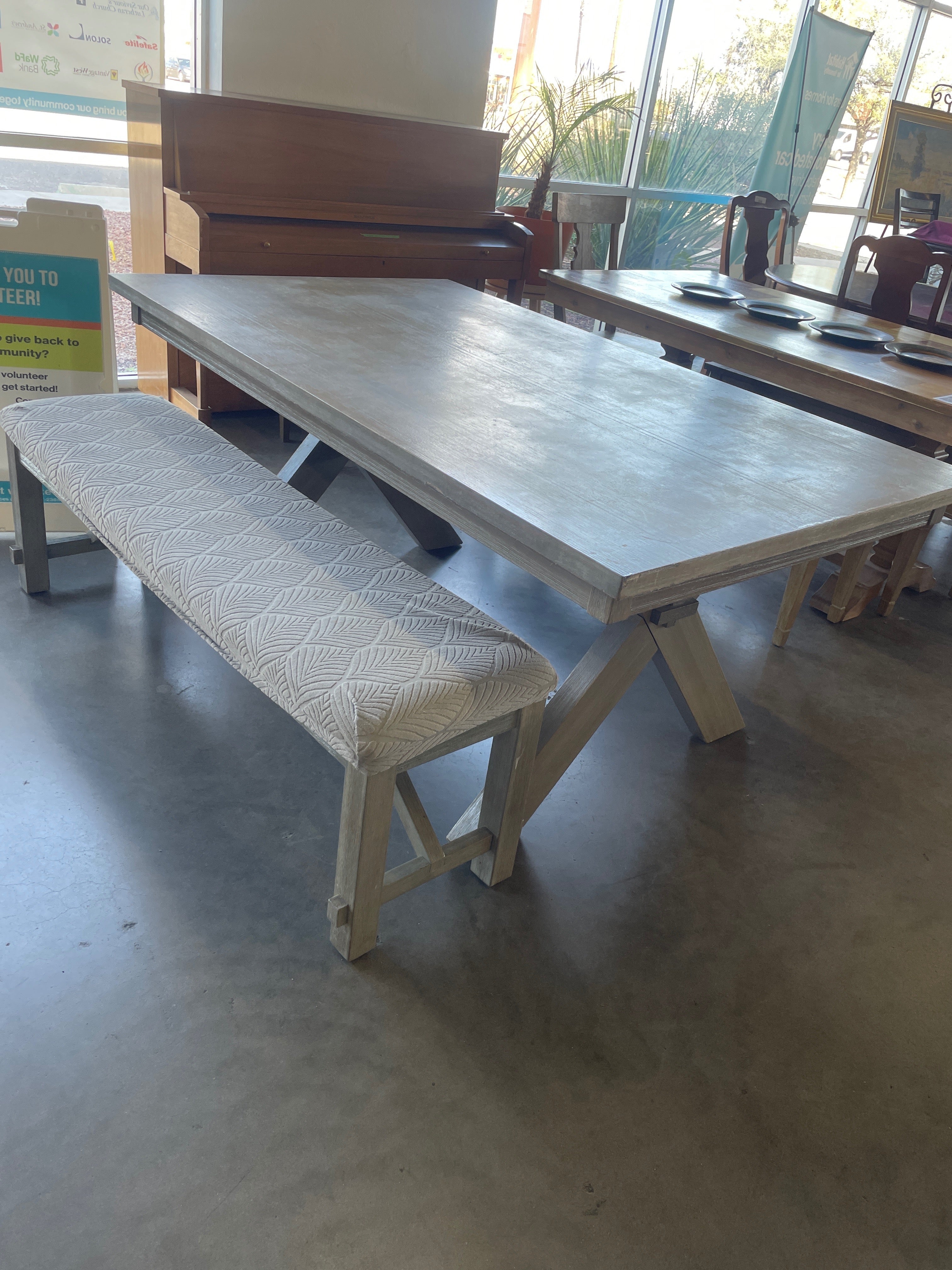This charming dining set features a rustic wood finish in a light, weathered gray tone. The accompanying bench is upholstered with a stylish, textured fabric in a soft neutral color, adding a cozy touch to your dining area. Approximate Size: 2.5 x 7 x 3