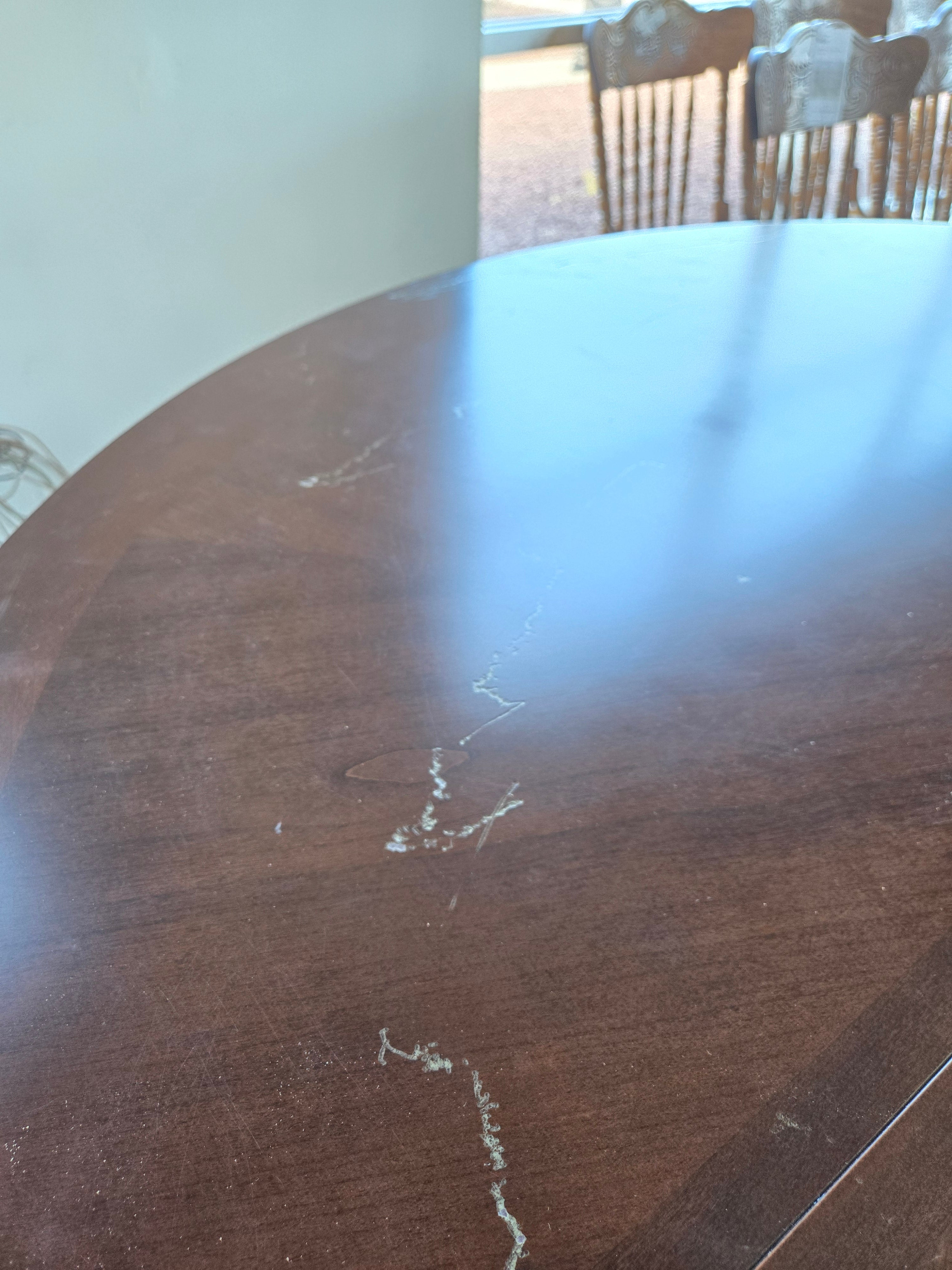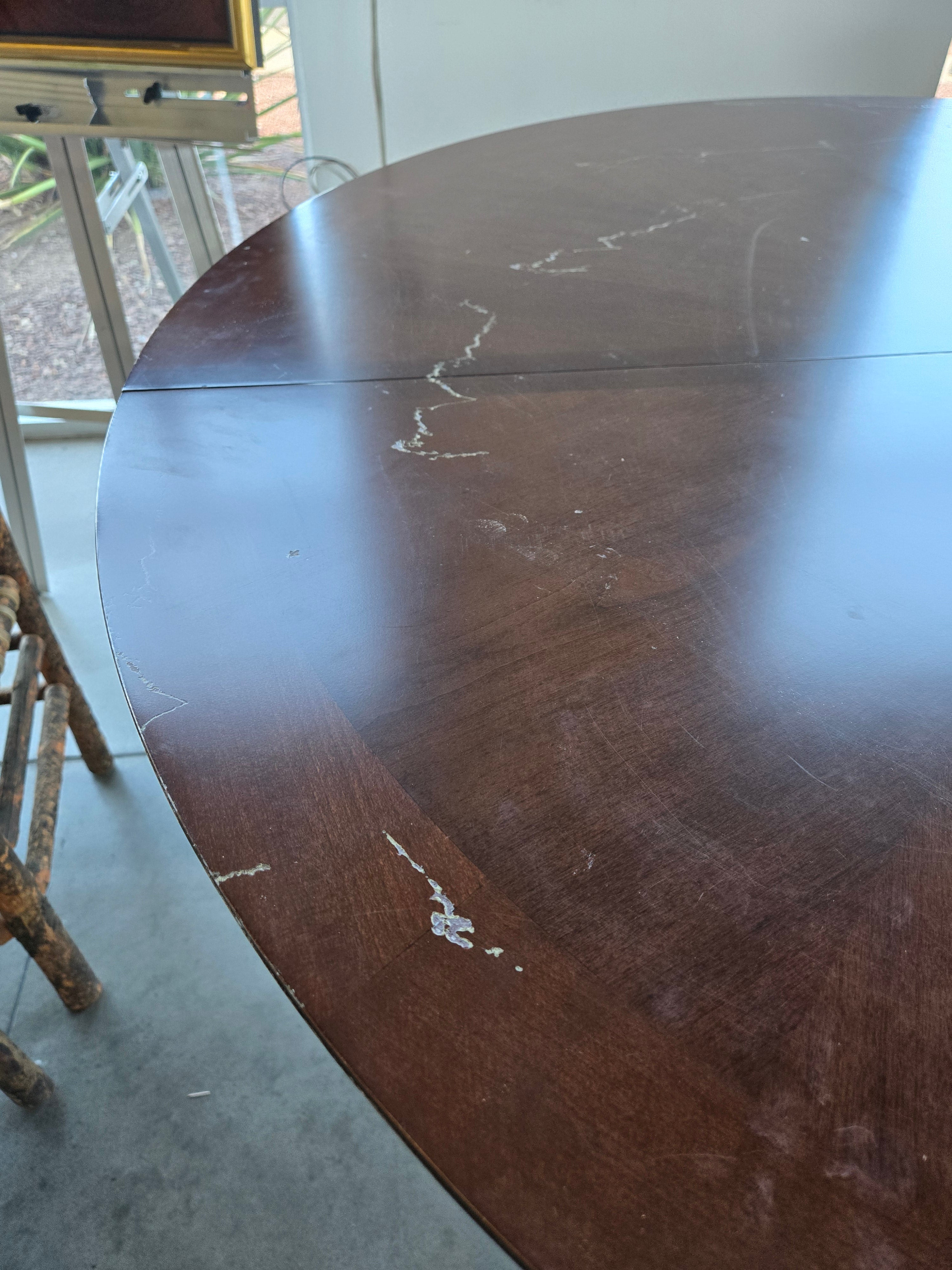 This elegant round dining table features a rich dark wood finish, perfect for creating a warm and inviting dining atmosphere. Approximate Size: 3 x 4 x 4