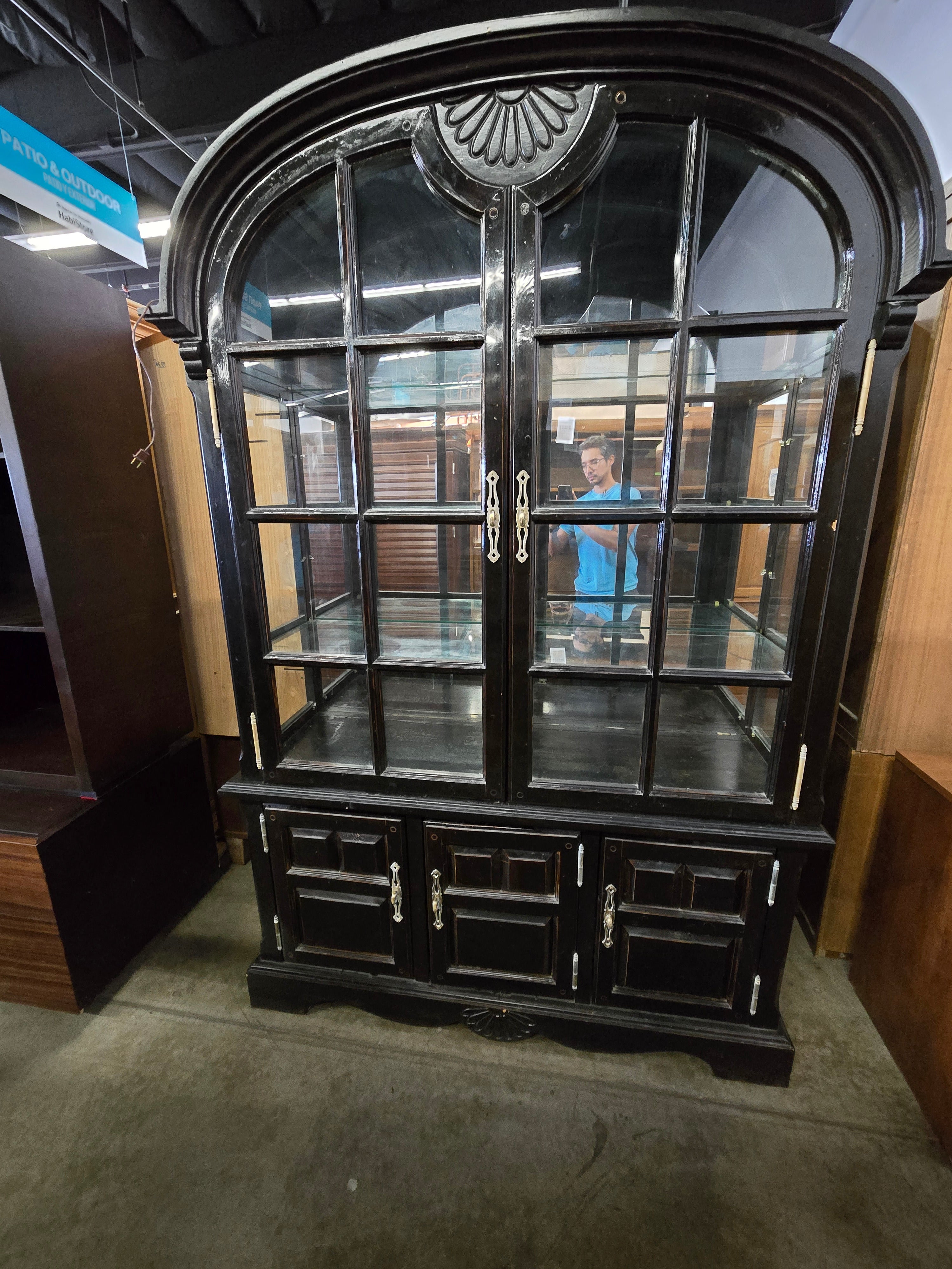 This elegant china cabinet features a classic black finish and glass-paneled doors, allowing for elegant display of your china and collectibles. The wooden construction offers durability and a timeless look. Approximate Size: 7 x 4 x 1.5