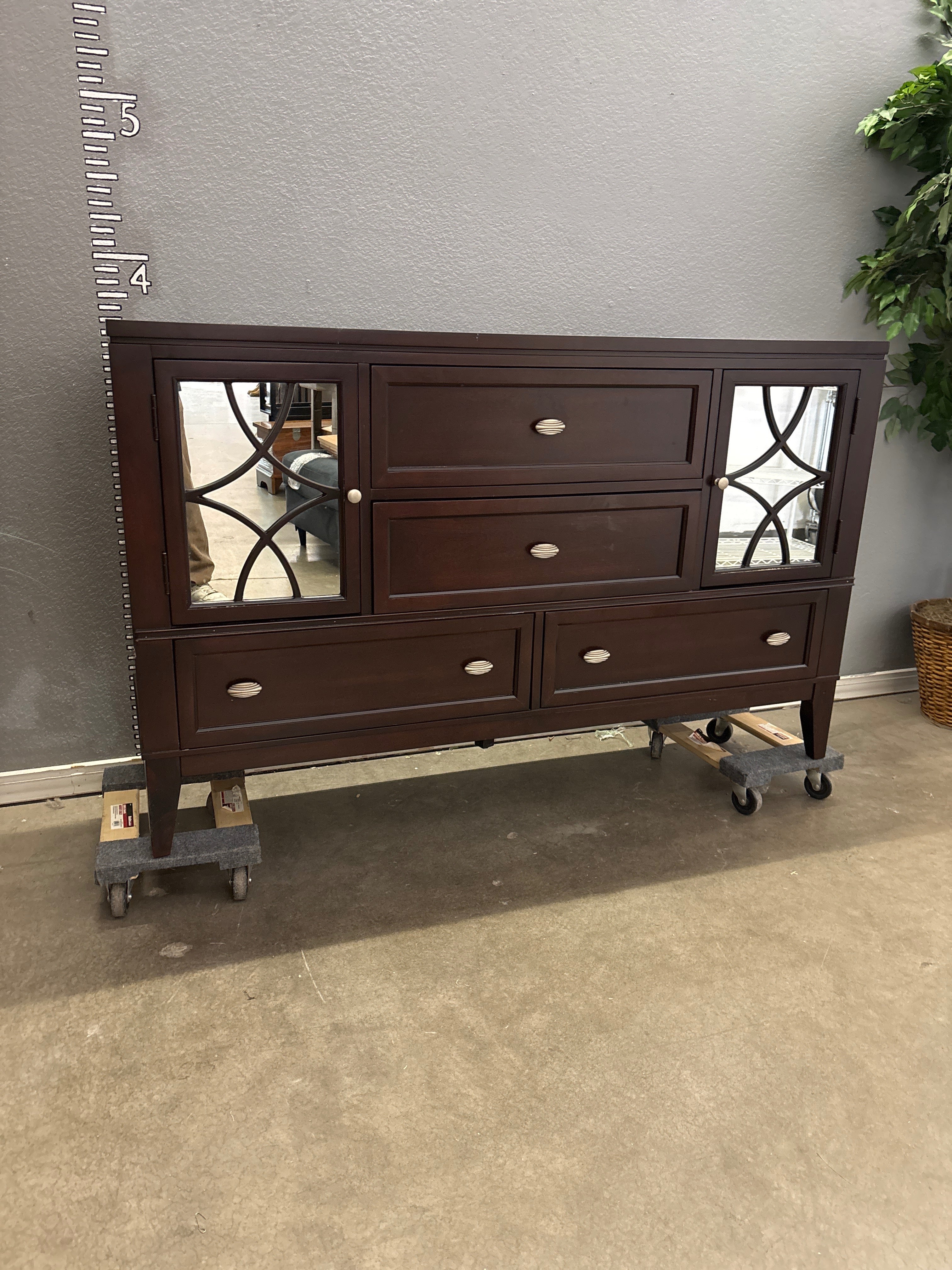 This stylish mahogany buffet cabinet features a rich brown finish and elegant mirrored accents on the side doors. With ample storage space, it is both functional and decorative. Approximate Size: 4.5 x 5 x 1.5