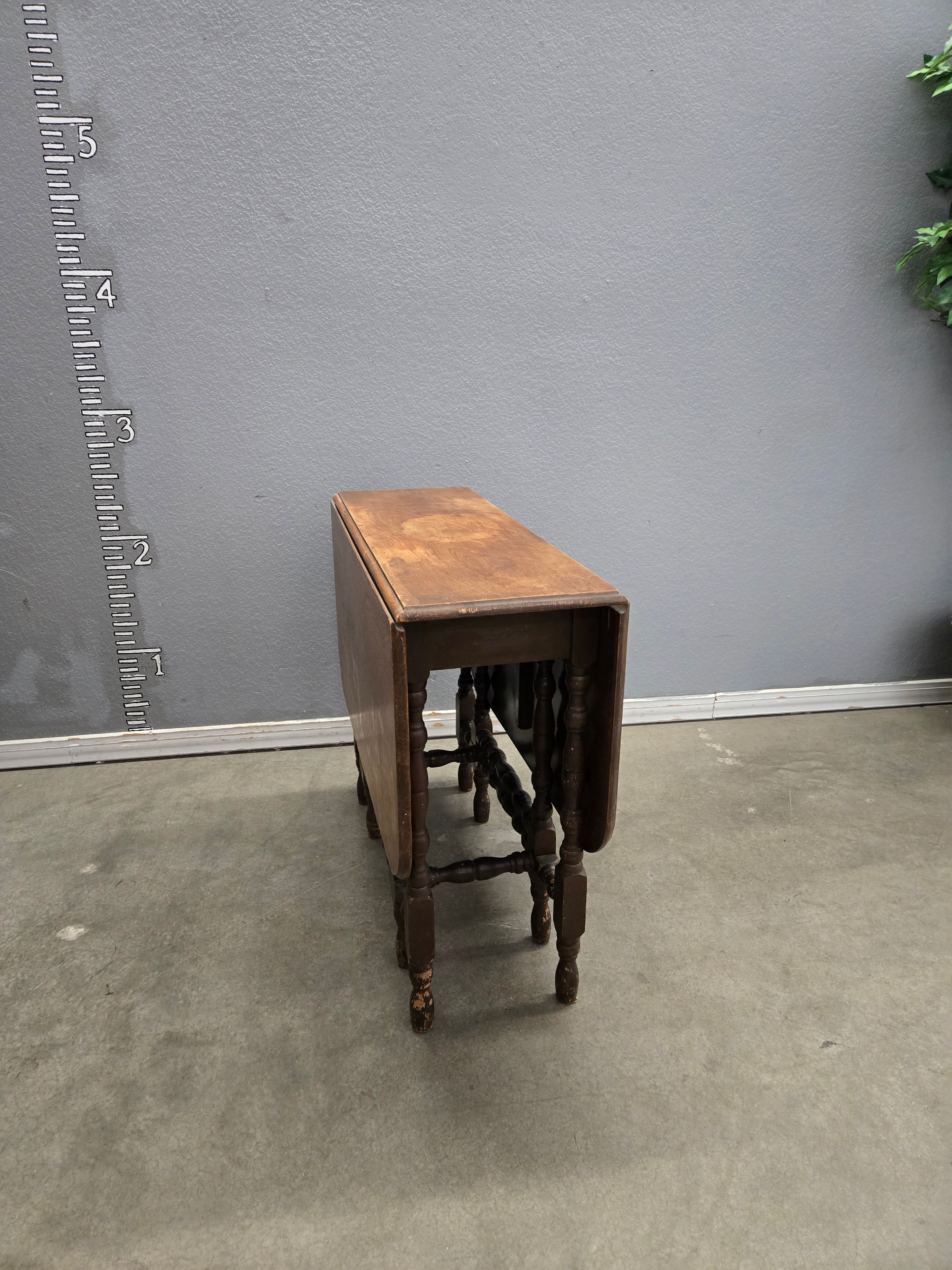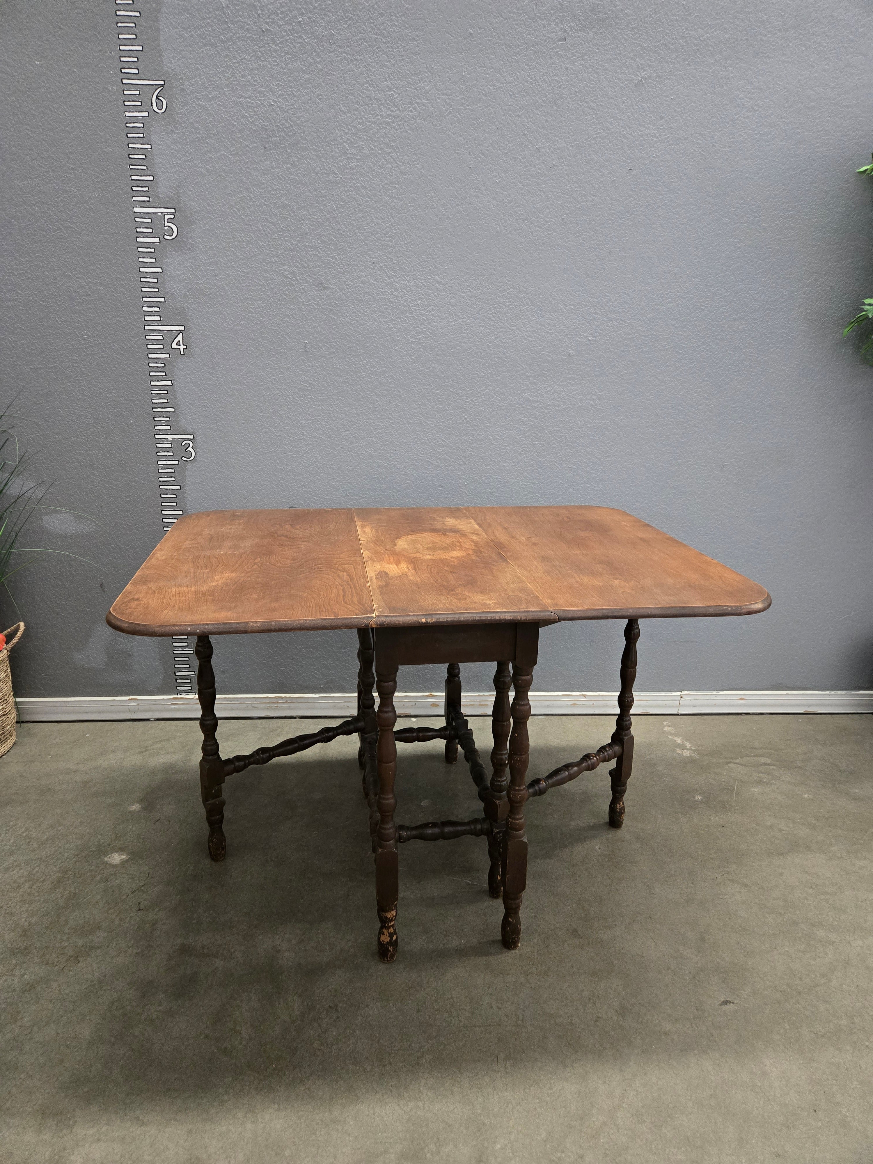 This charming vintage dining table features a warm brown wood finish, showcasing a classic design with drop-leaf sides. Ideal for smaller dining areas or as an occasional table. Approximate Size: 2.5 x 3 x 2
