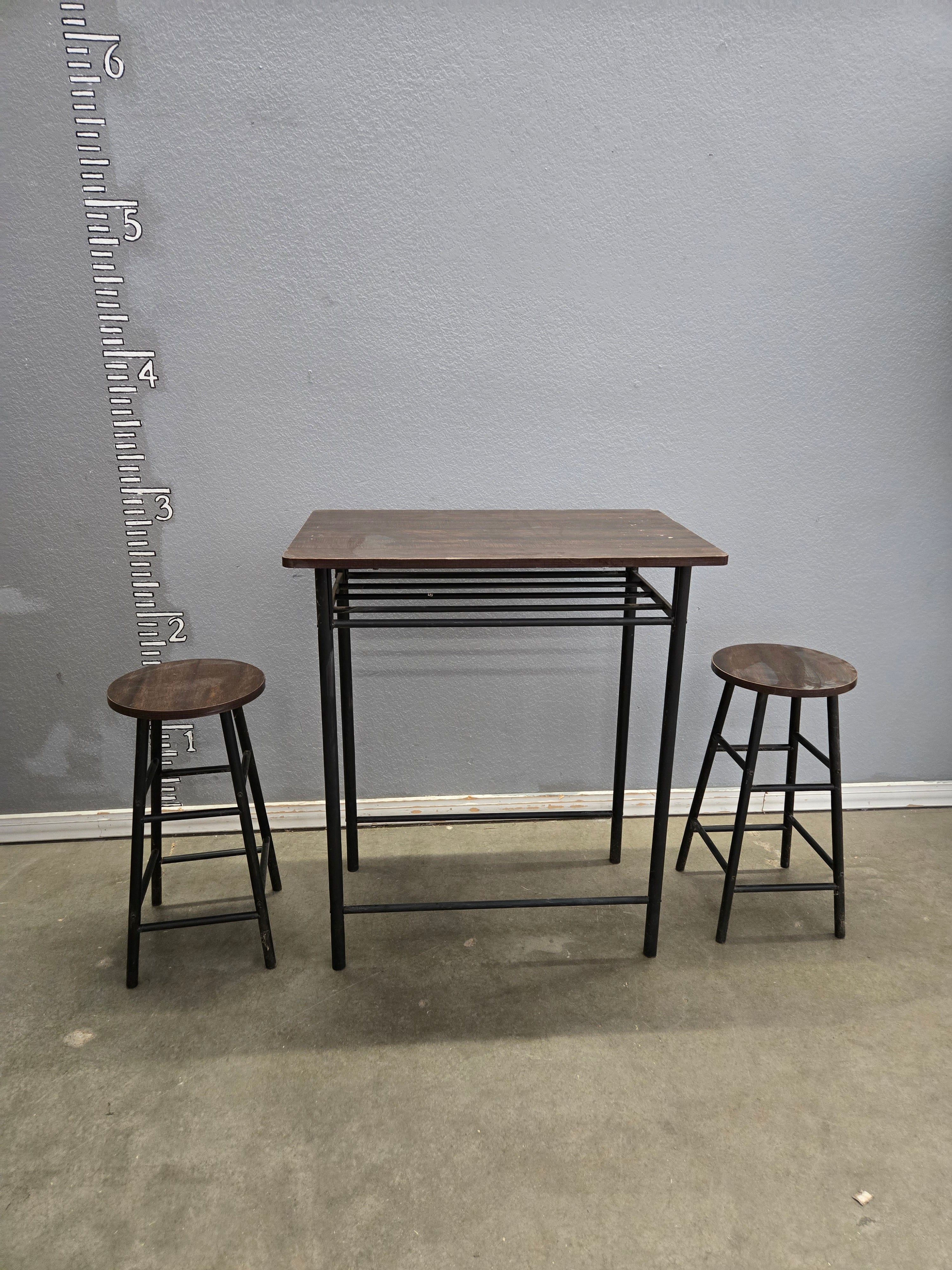 This charming bistro table set features a rustic brown wood finish with black metal legs, providing a sturdy yet stylish addition to your space. The set includes a rectangular table and two matching stools, perfect for small dining areas or as a casual setup in your kitchen or patio. Approximate Size: 3 x 2 x 1.5