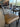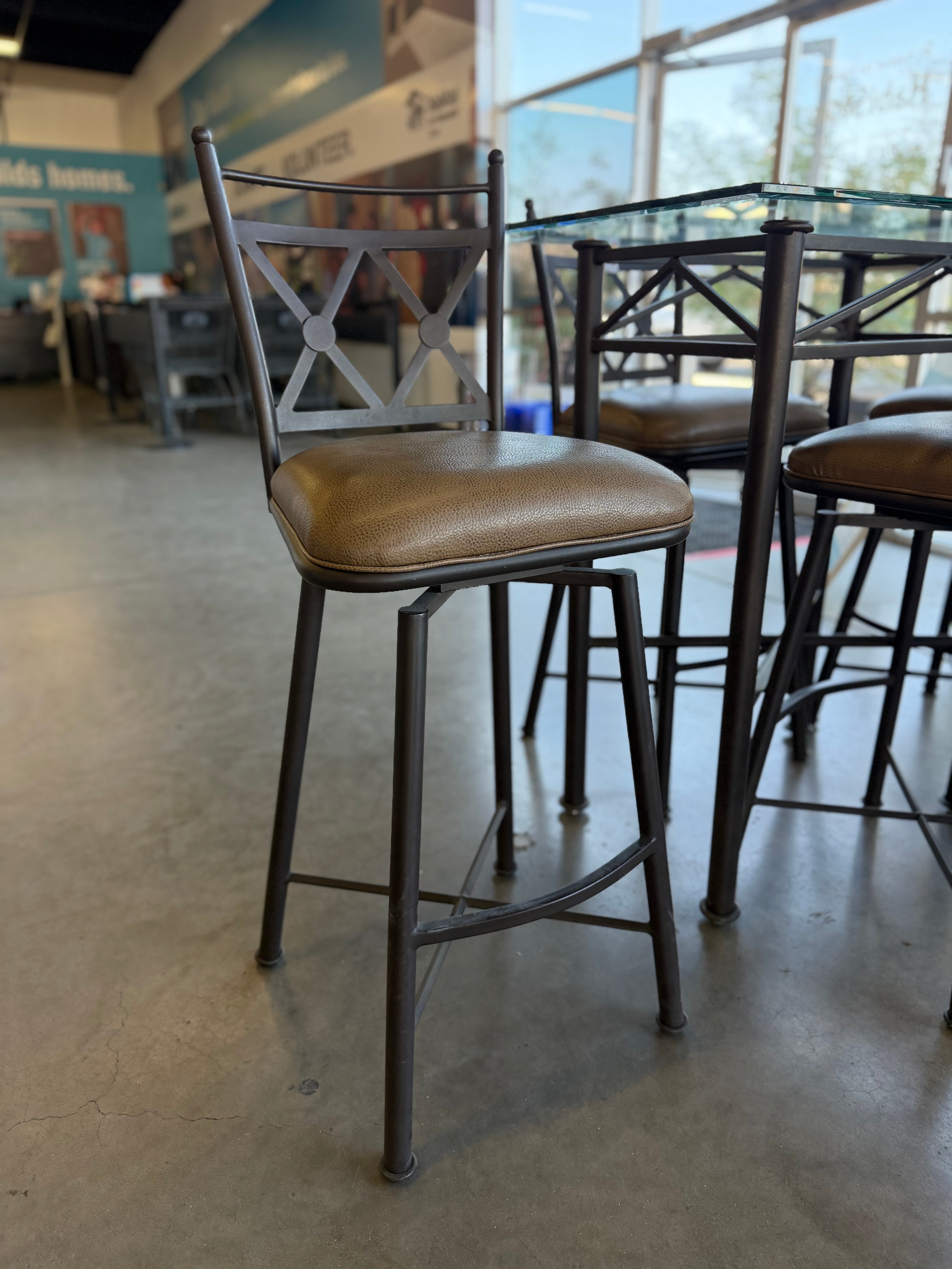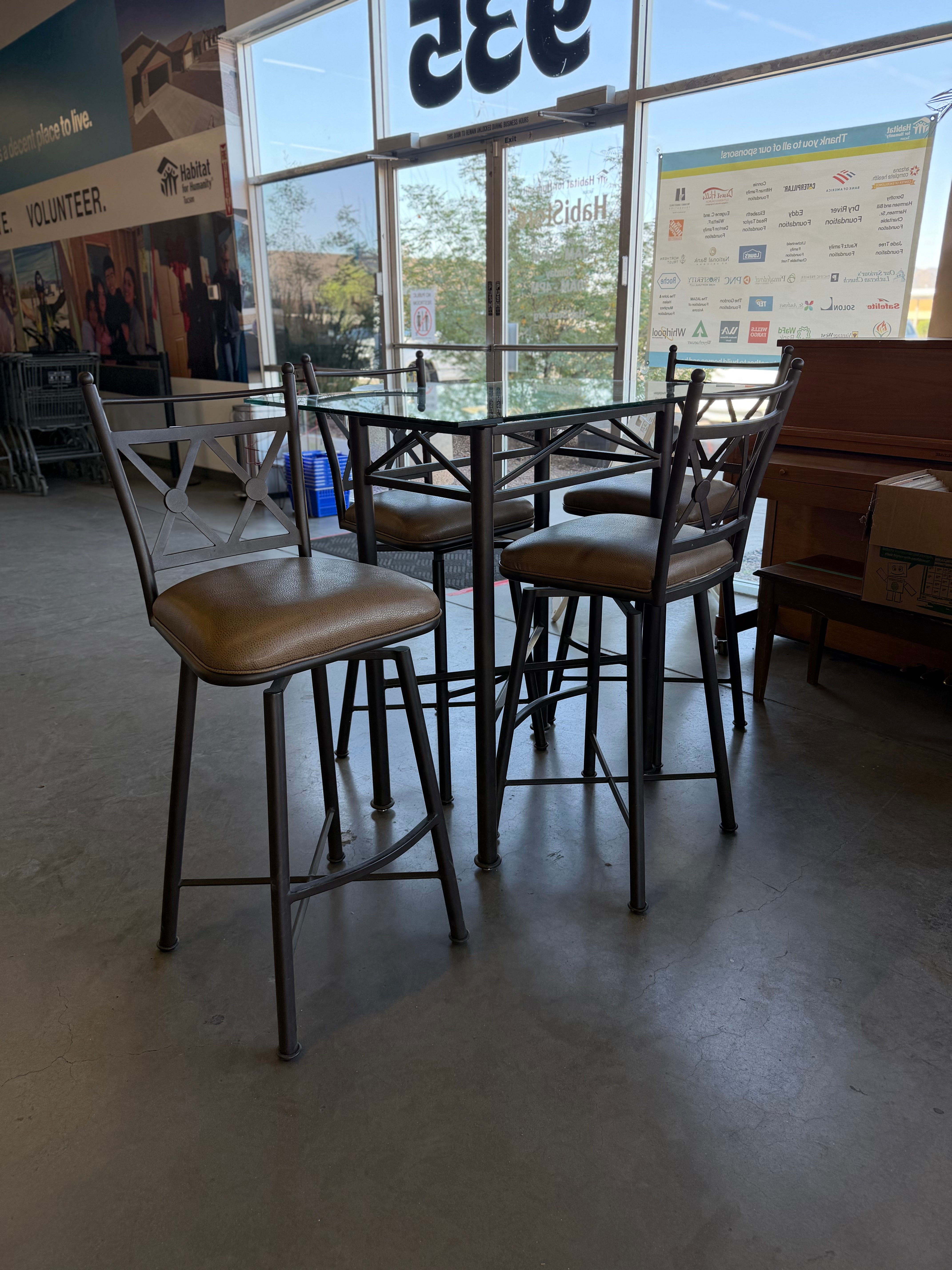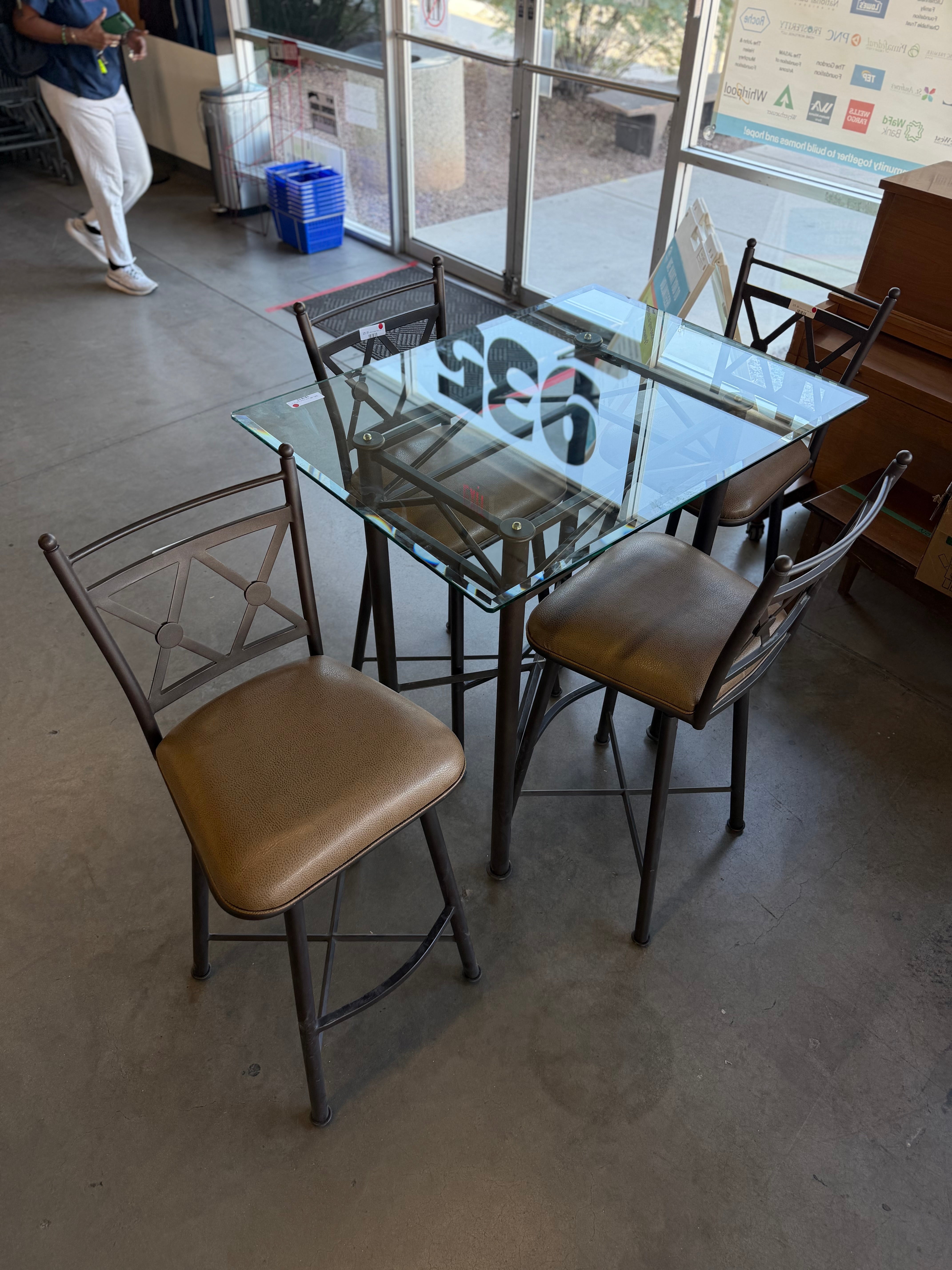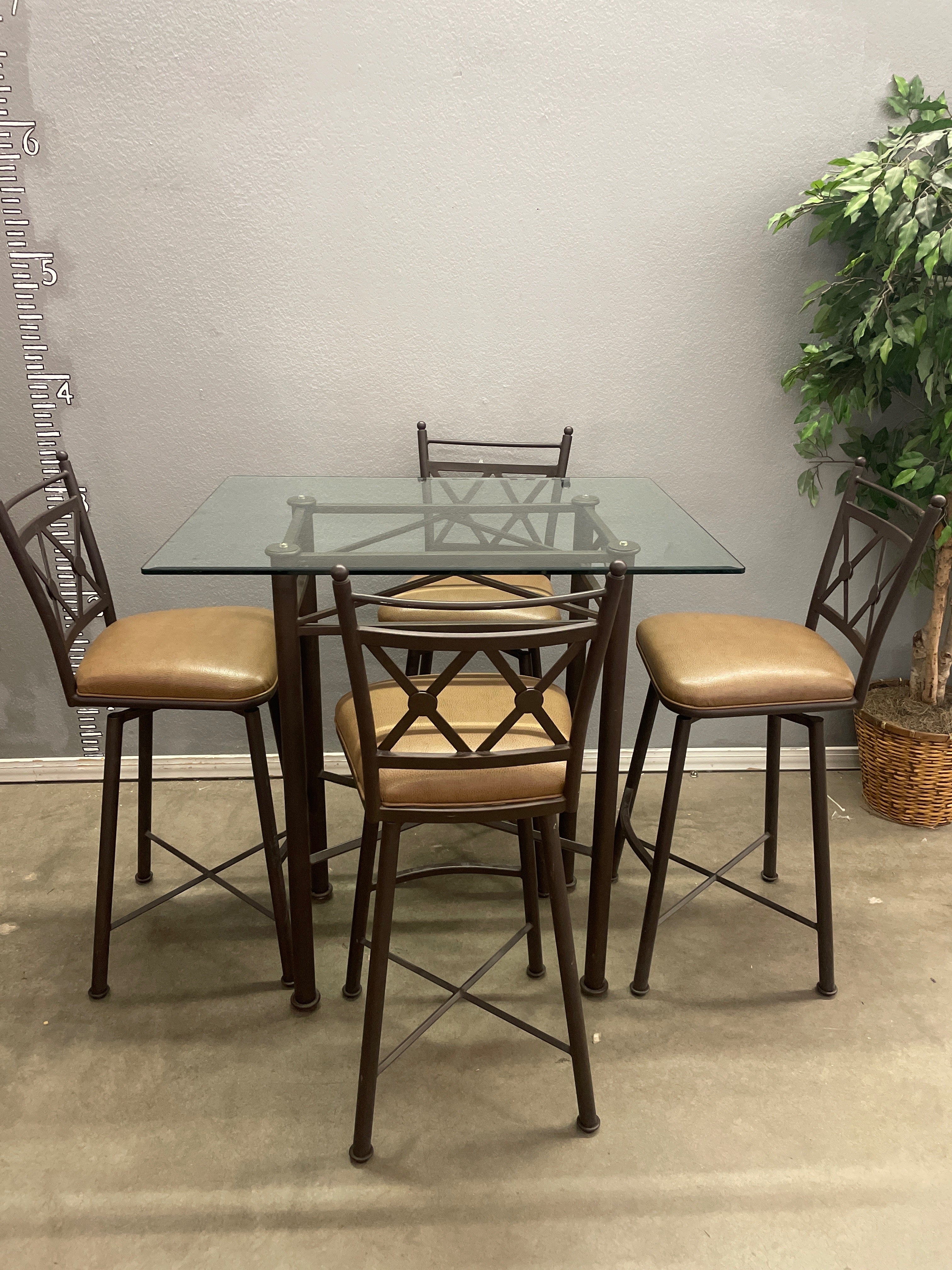 This stylish dining set features a transparent glass top table with a sleek metal frame in a rich dark brown finish. Accompanied by four bar stools with comfortable tan leatherette upholstery, this set adds sophistication to any dining space. Approximate Size: 3 x 3.5 x 3.5