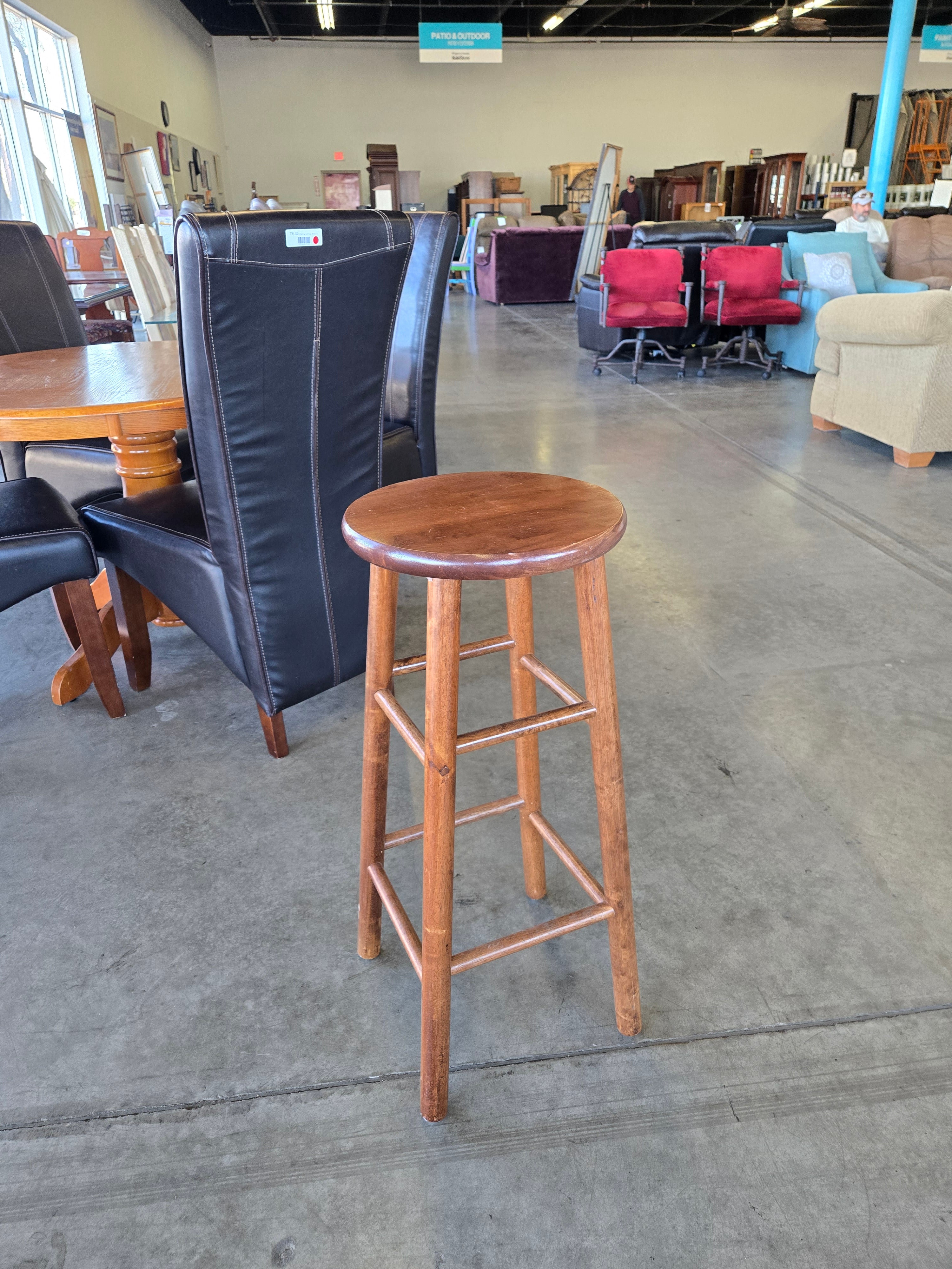 A classic wooden bar stool with a warm brown finish. Perfect for adding a rustic touch to your kitchen or bar area. Approximate Size: 2.5 x 1 x 1