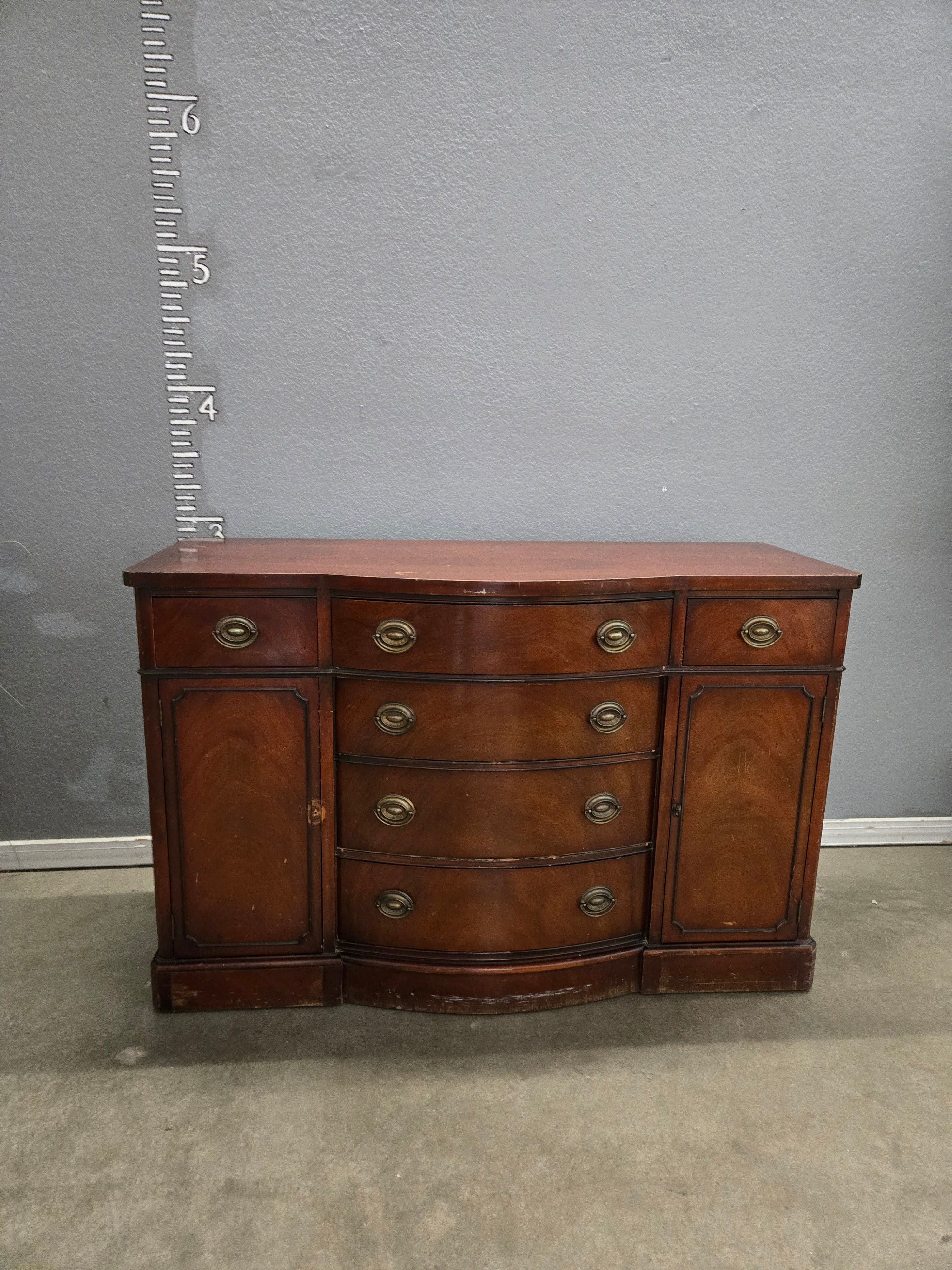 This classic sideboard buffet features a rich mahogany finish with elegant bronze hardware. Its traditional design offers ample storage with its drawers and cabinets, making it a perfect addition to any dining room. Approximate Size: 3.5 x 5 x 1.5