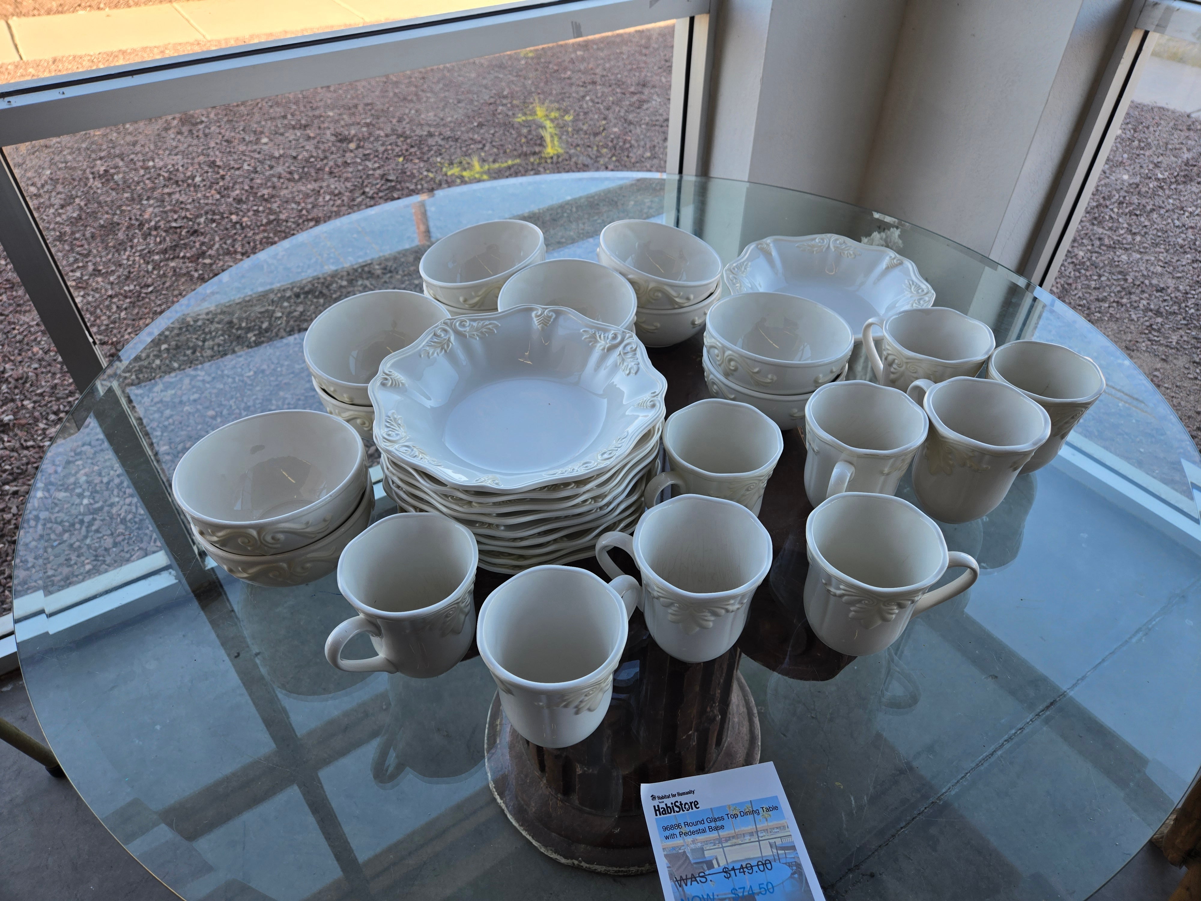 This elegant white ceramic dinnerware set features a classic embossed design. The set includes plates, bowls, and mugs, all in a smooth, glossy finish. Perfect for enhancing your dining experience. Approximate Size: 1.5 x 1.5 x 1.5
