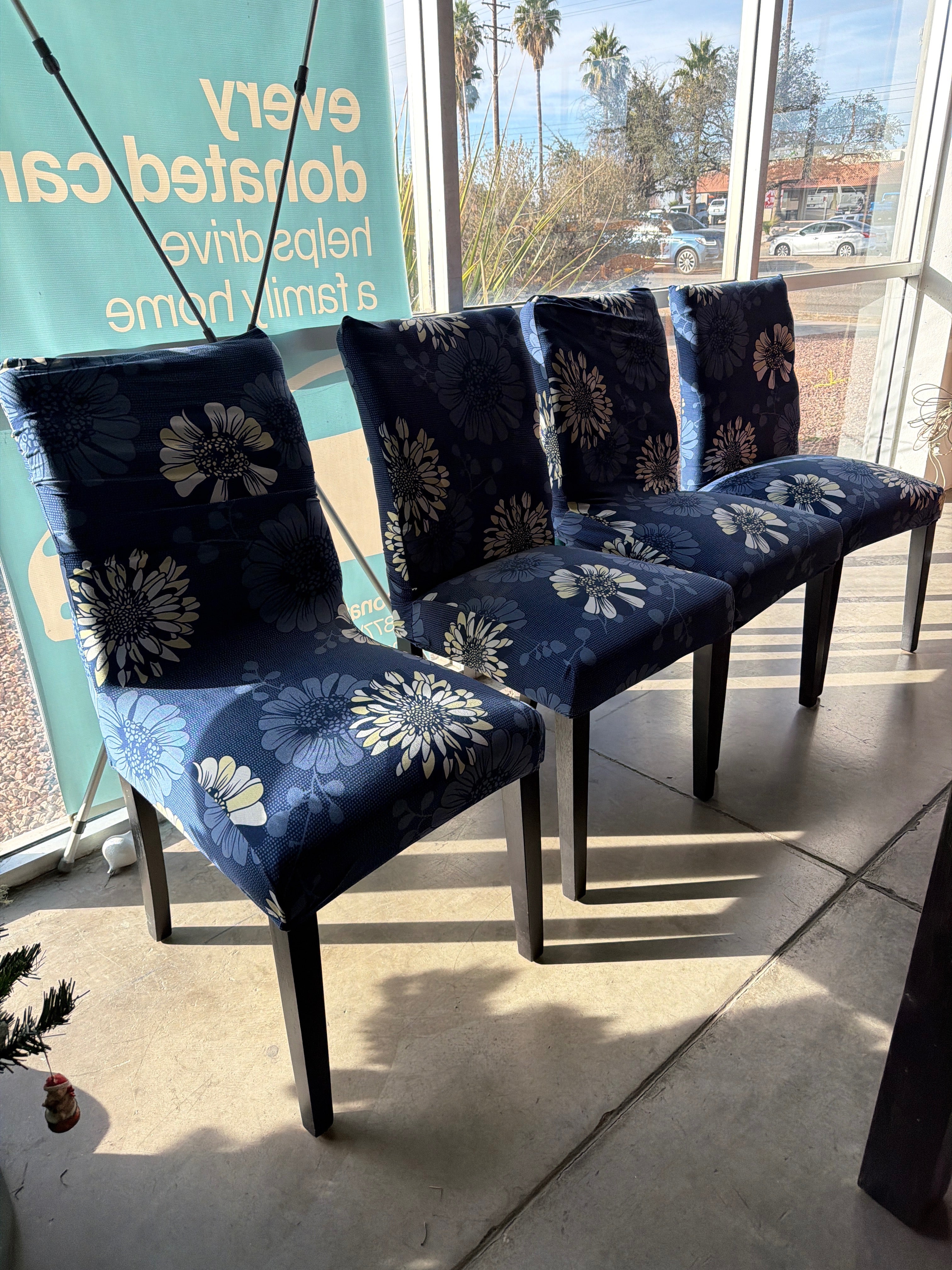 This elegant set of four dining chairs features a striking dark blue fabric with a bold floral pattern. Each chair is upholstered in a soft, durable fabric, perfect for adding a touch of sophistication to your dining room. Approximate Size: 3 x 1.5 x 1.5