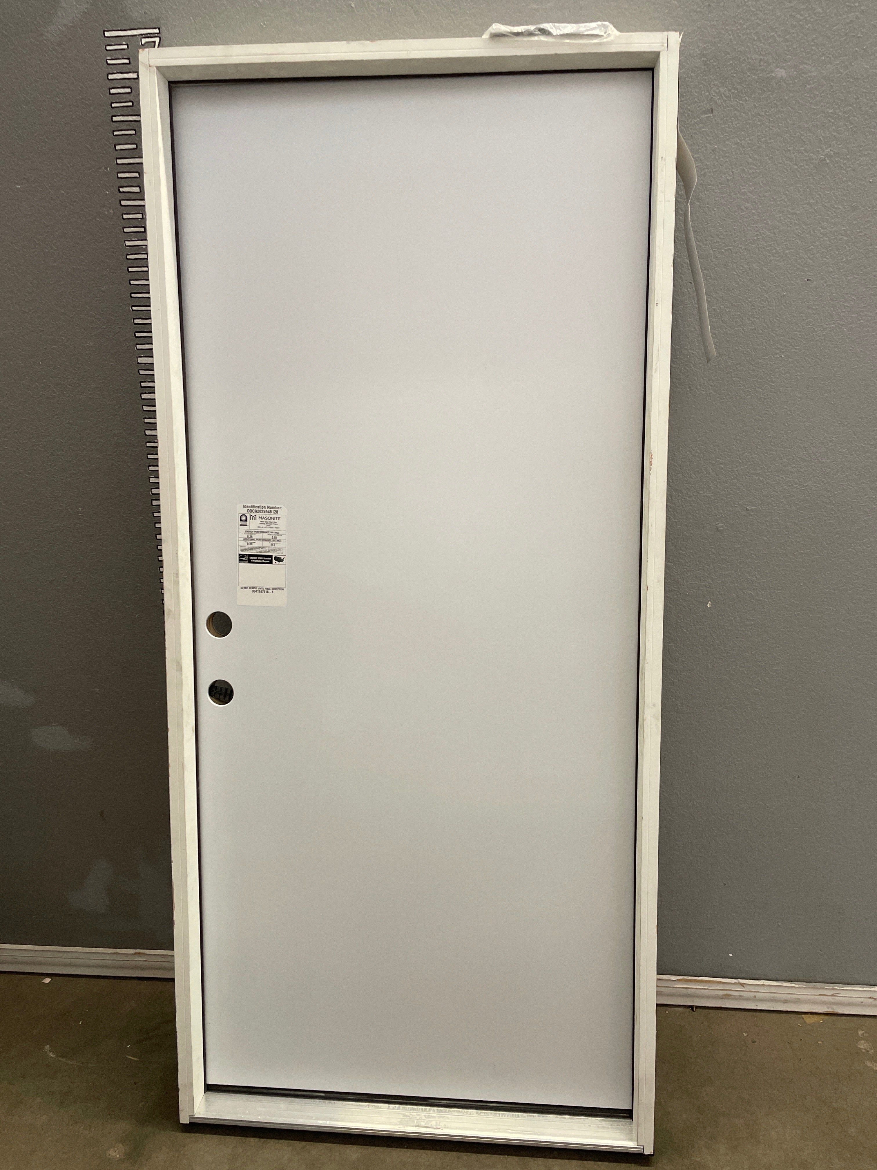 This sleek, modern exterior door features a smooth white finish. It comes with a sturdy frame and pre-drilled lock holes, ready for installation. Approximate Size: 7 x 3 x 0.15