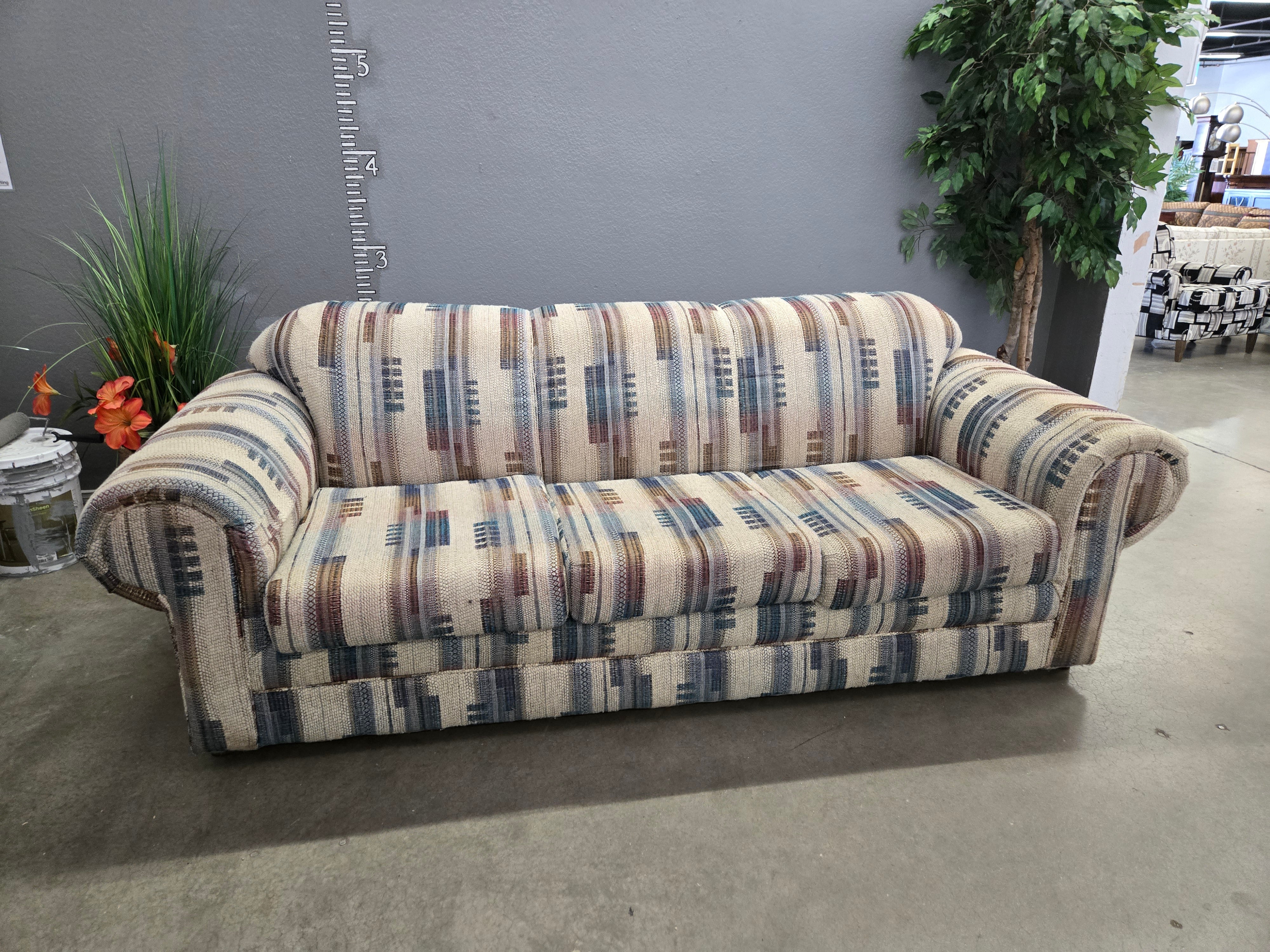 This stylish sofa features a multicolored patterned fabric with a textured finish. The neutral tones with subtle hints of blue and red create a cozy and inviting atmosphere. Approximate Size: 3 x 6 x 3