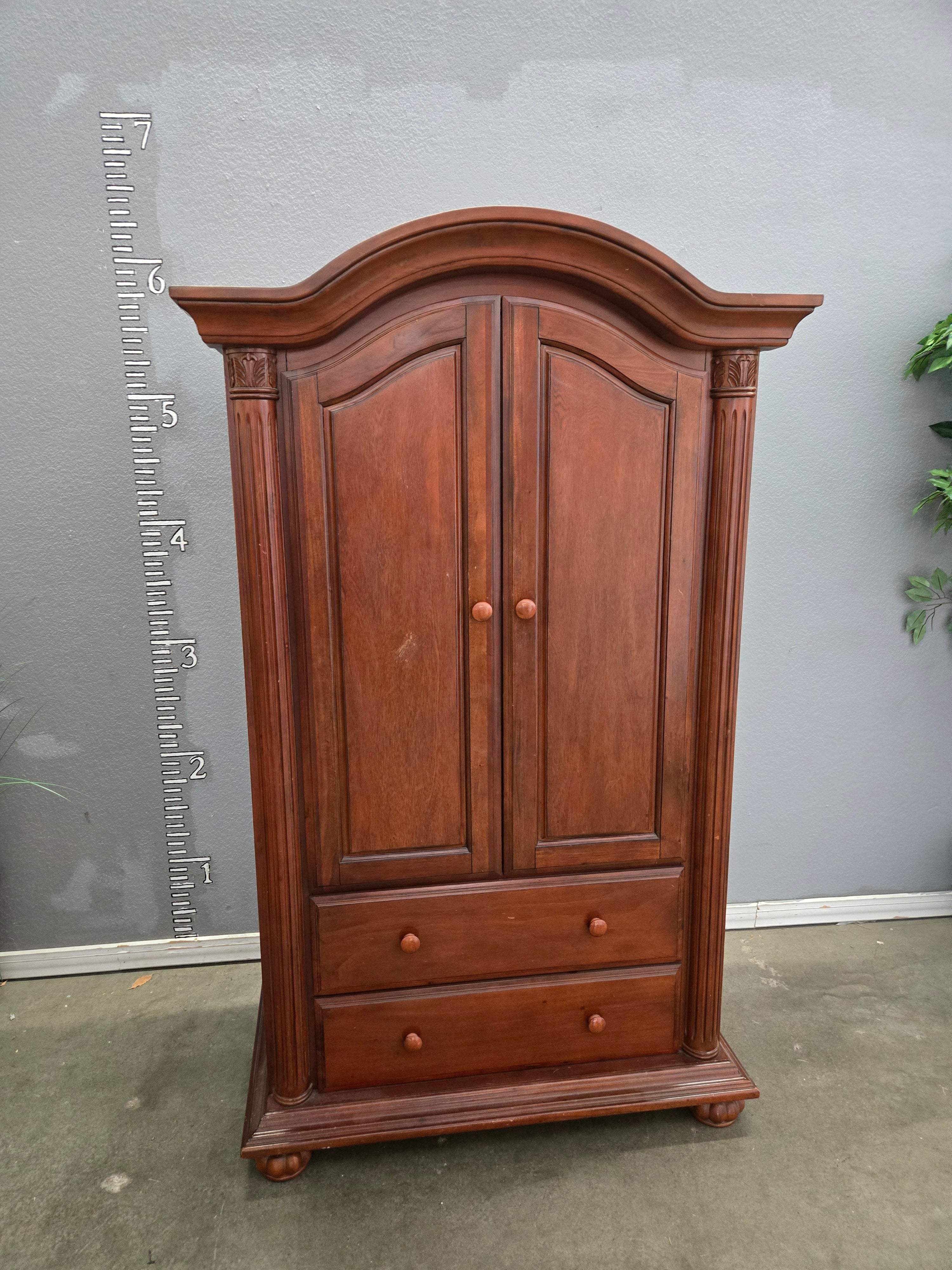 This vintage armoire features a rich brown finish with an elegant, curved top design. Crafted from solid wood, it includes two spacious doors and two drawers for ample storage. The classic wooden knobs add a touch of traditional style. Approximate Size: 6.5 x 3 x 1.5