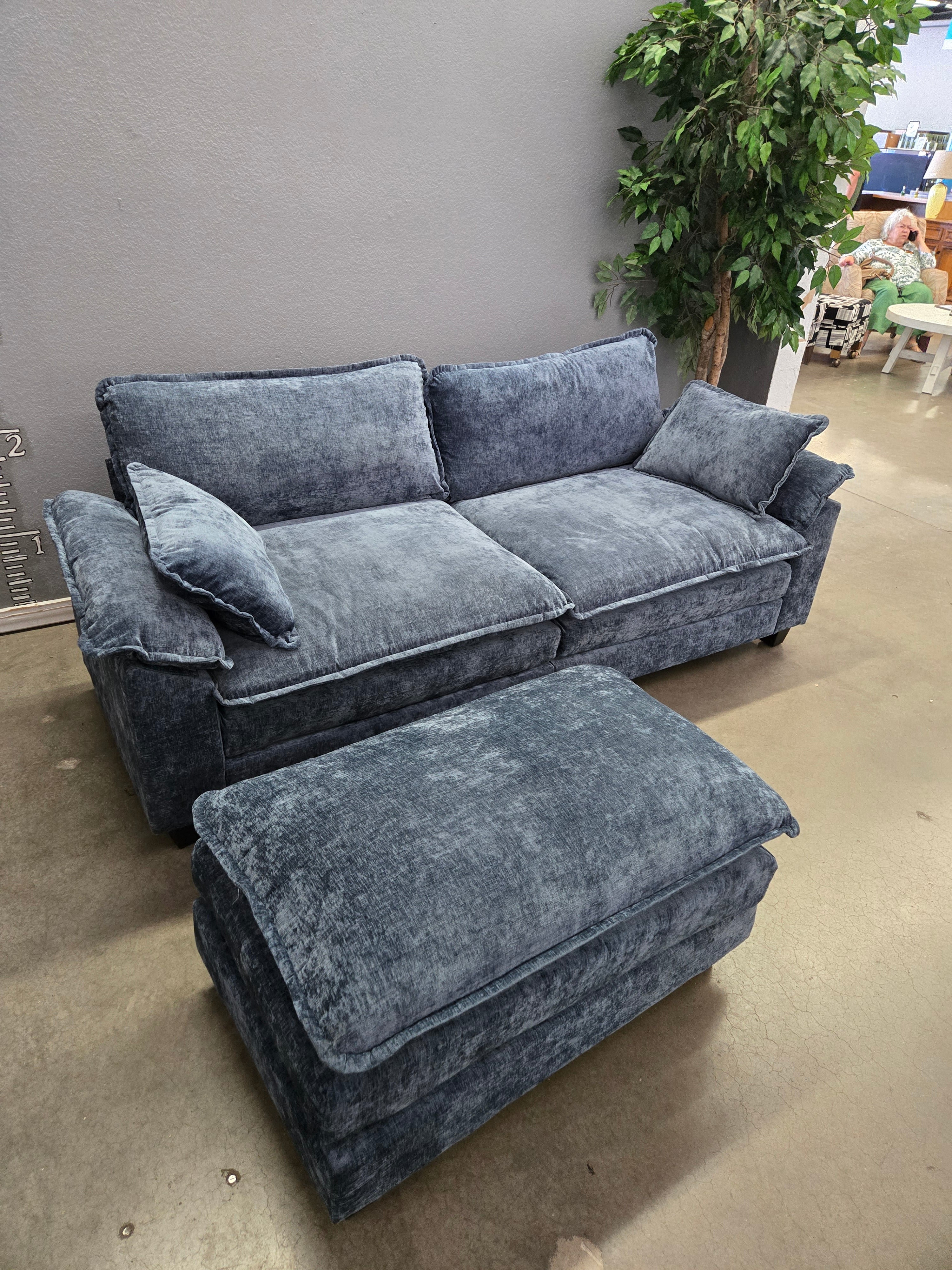 A comfortable and stylish sofa and ottoman set upholstered in a luxurious blue velvet fabric. The set features a soft, plush texture perfect for relaxing. Approximate Size: 3 x 6 x 3