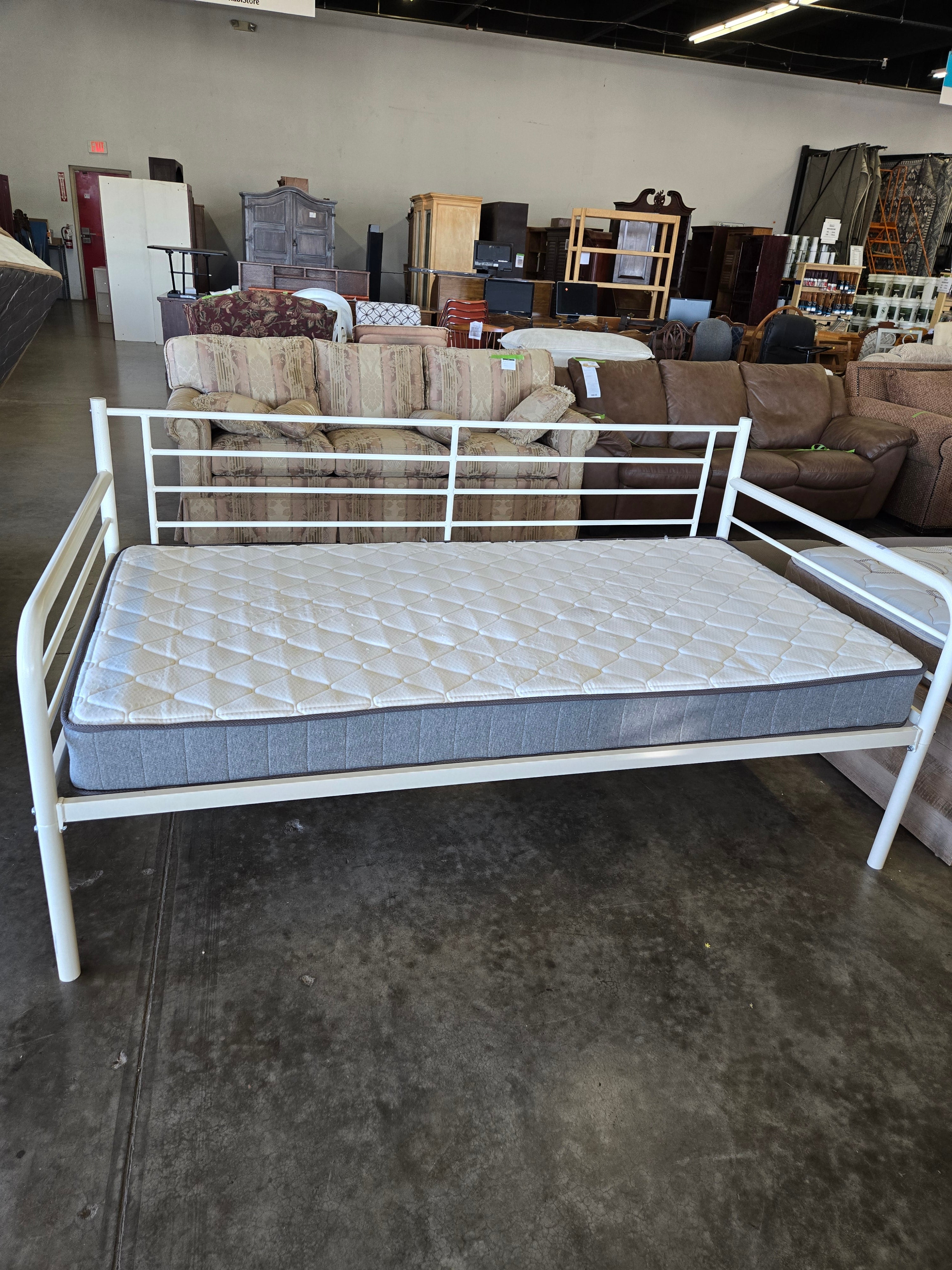 This stylish daybed frame features a sleek white finish, crafted from durable metal. Its open slatted design adds a modern touch, perfect for any contemporary living space. Approximate Size: 3 x 6.5 x 3.5