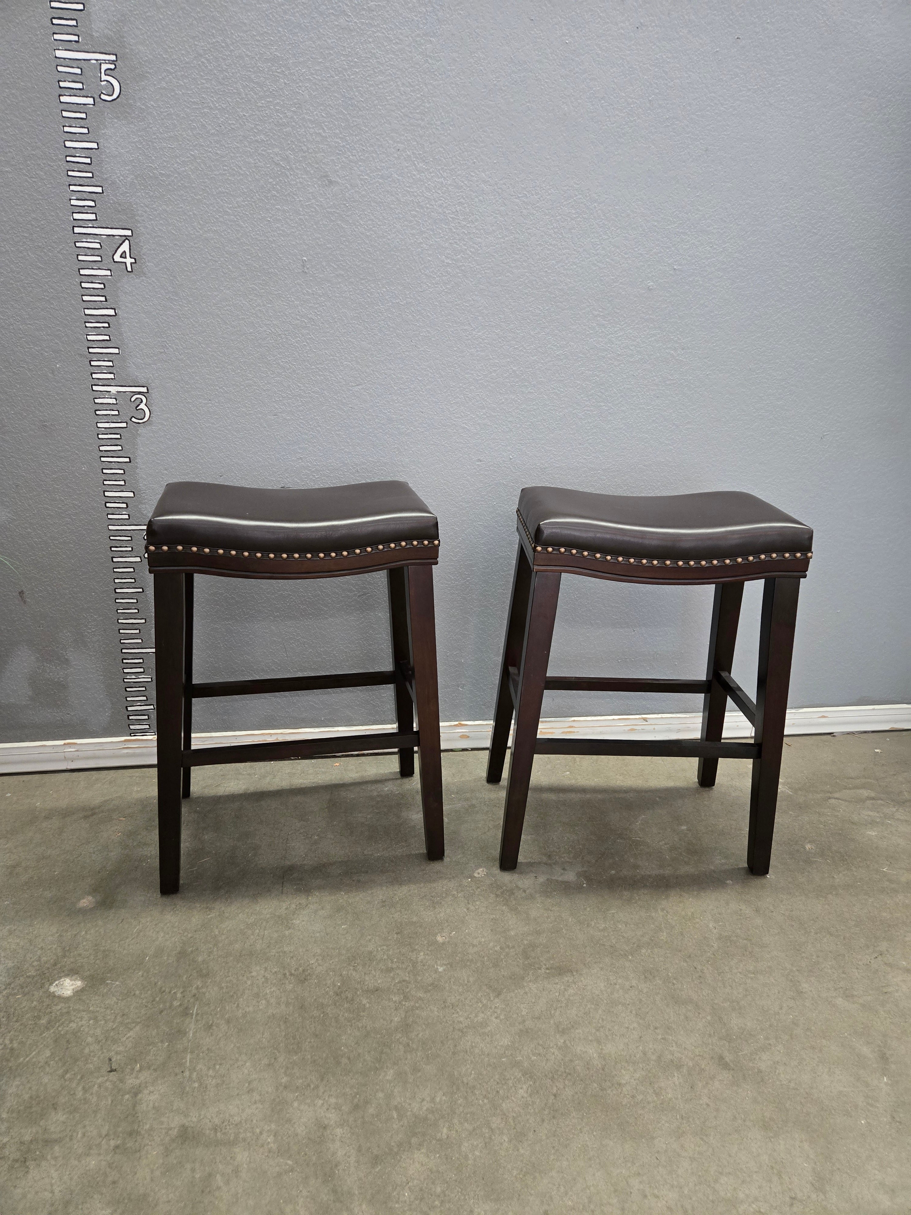 This stylish pair of bar stools features a dark wood frame with a sleek faux leather seat. The soft, cushioned seats provide comfort and are adorned with nailhead trim for a sophisticated finish. Approximate Size: 3 x 1.5 x 1.5