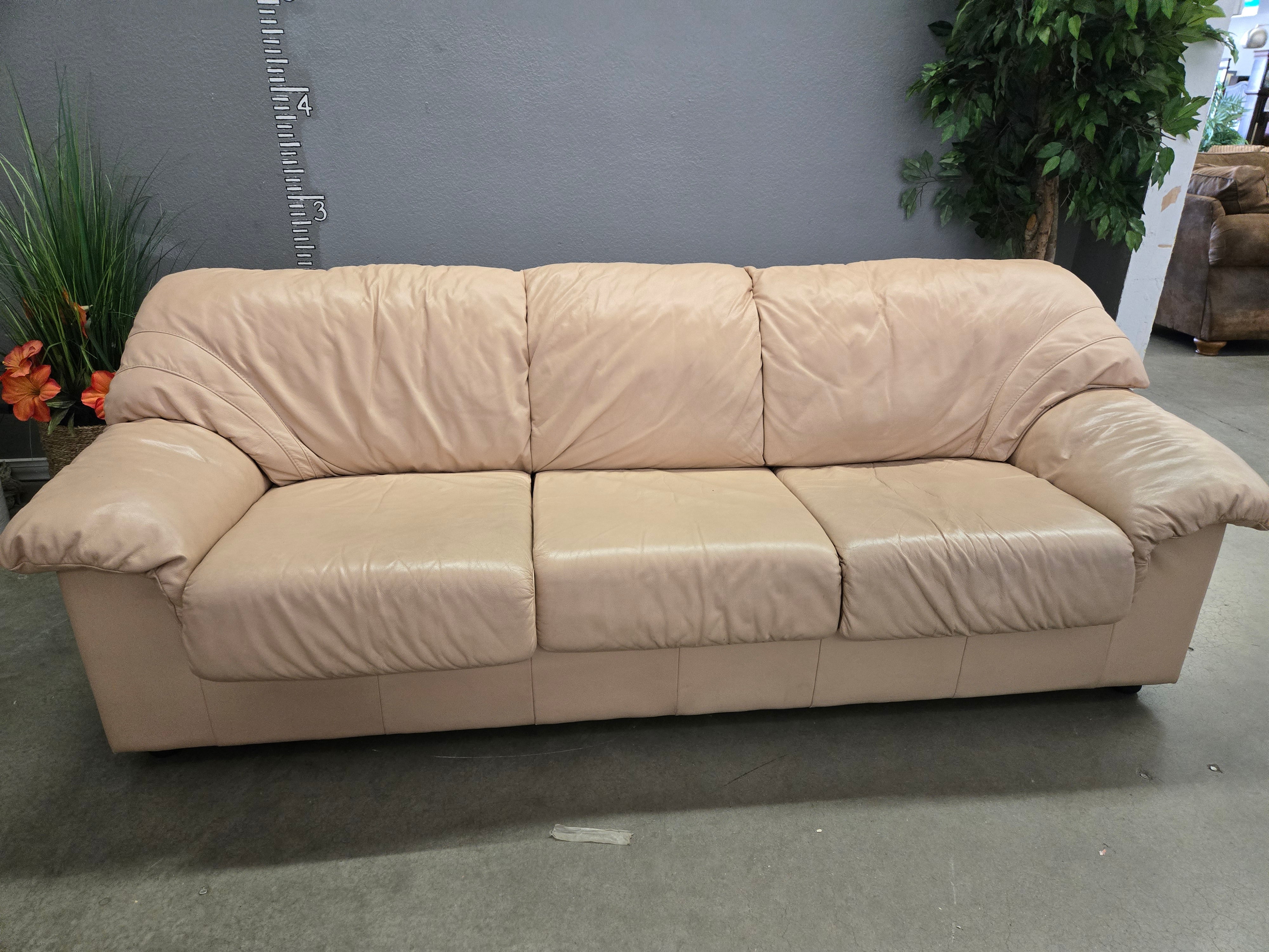 Luxurious beige leather sofa with a soft, smooth finish. Perfect for adding elegance and comfort to any living space. Approximate Size: 3 x 7 x 3