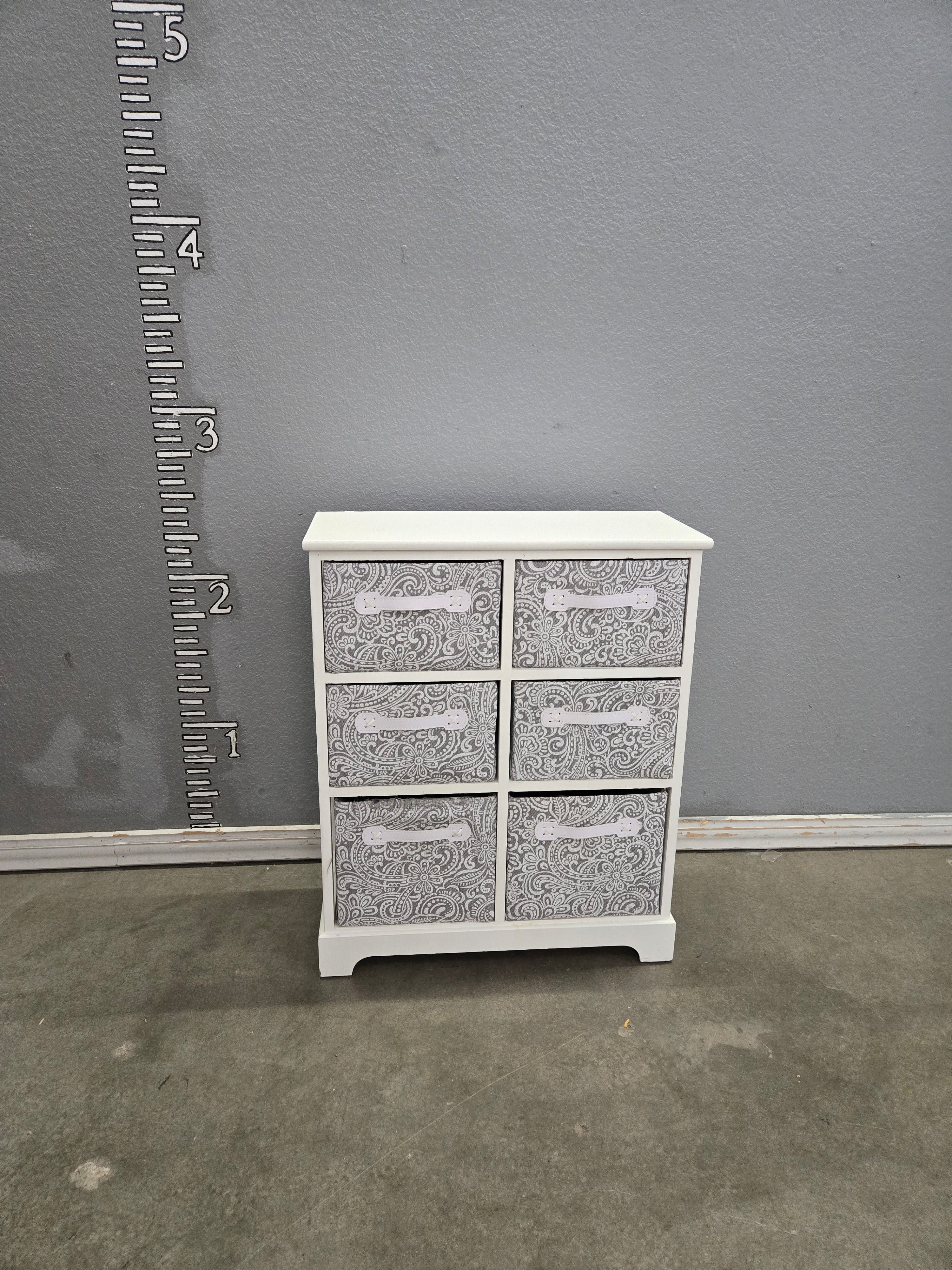 This elegant six-drawer storage cabinet features a sophisticated white finish with intricately designed fabric drawer fronts. The drawers are adorned with a subtle, paisley-inspired pattern, providing both style and functional storage. Approximate Size: 2.5 x 2 x 1