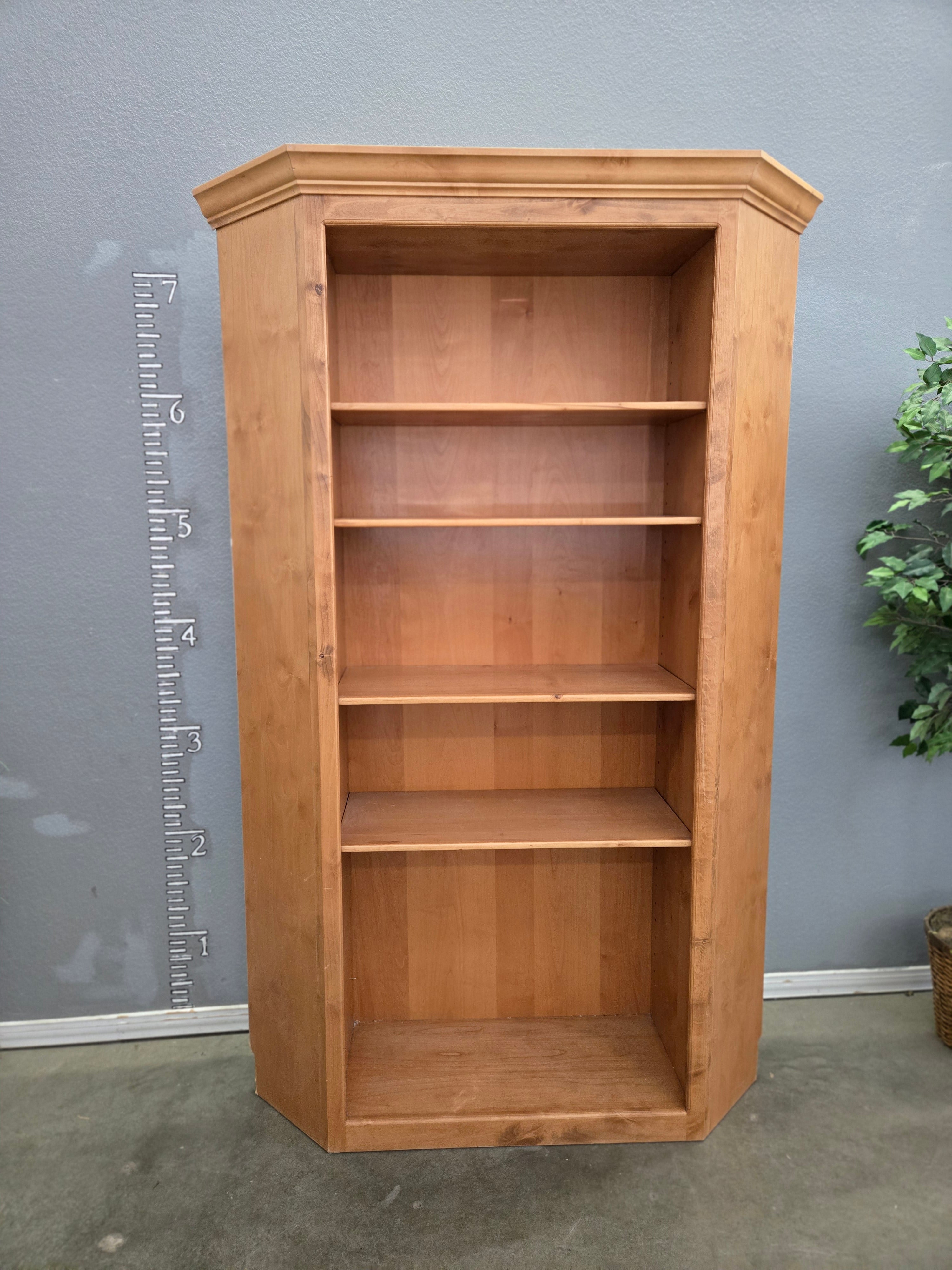 This corner bookshelf features a warm, natural wood finish that adds an inviting touch to any room. Its sturdy construction includes multiple shelves, ideal for displaying books and decorative items. Approximate Size: 6 x 2 x 1.5