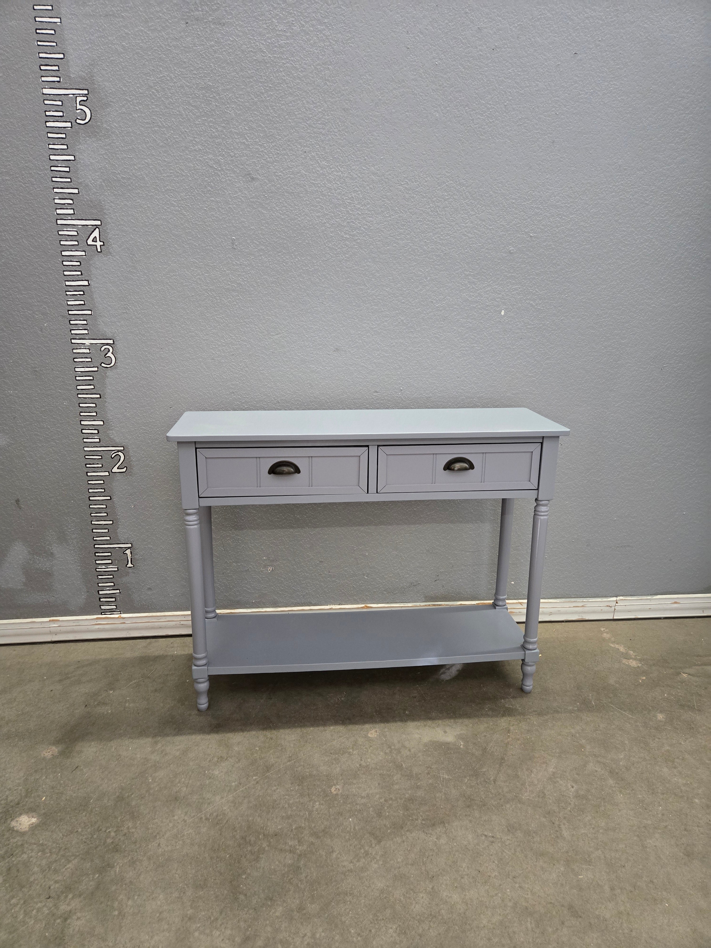 This elegant console table features a smooth gray finish with two spacious drawers for storage and a bottom shelf for additional display options. The sturdy construction and classic design make it a versatile piece for any room. Approximate Size: 3 x 4 x 1