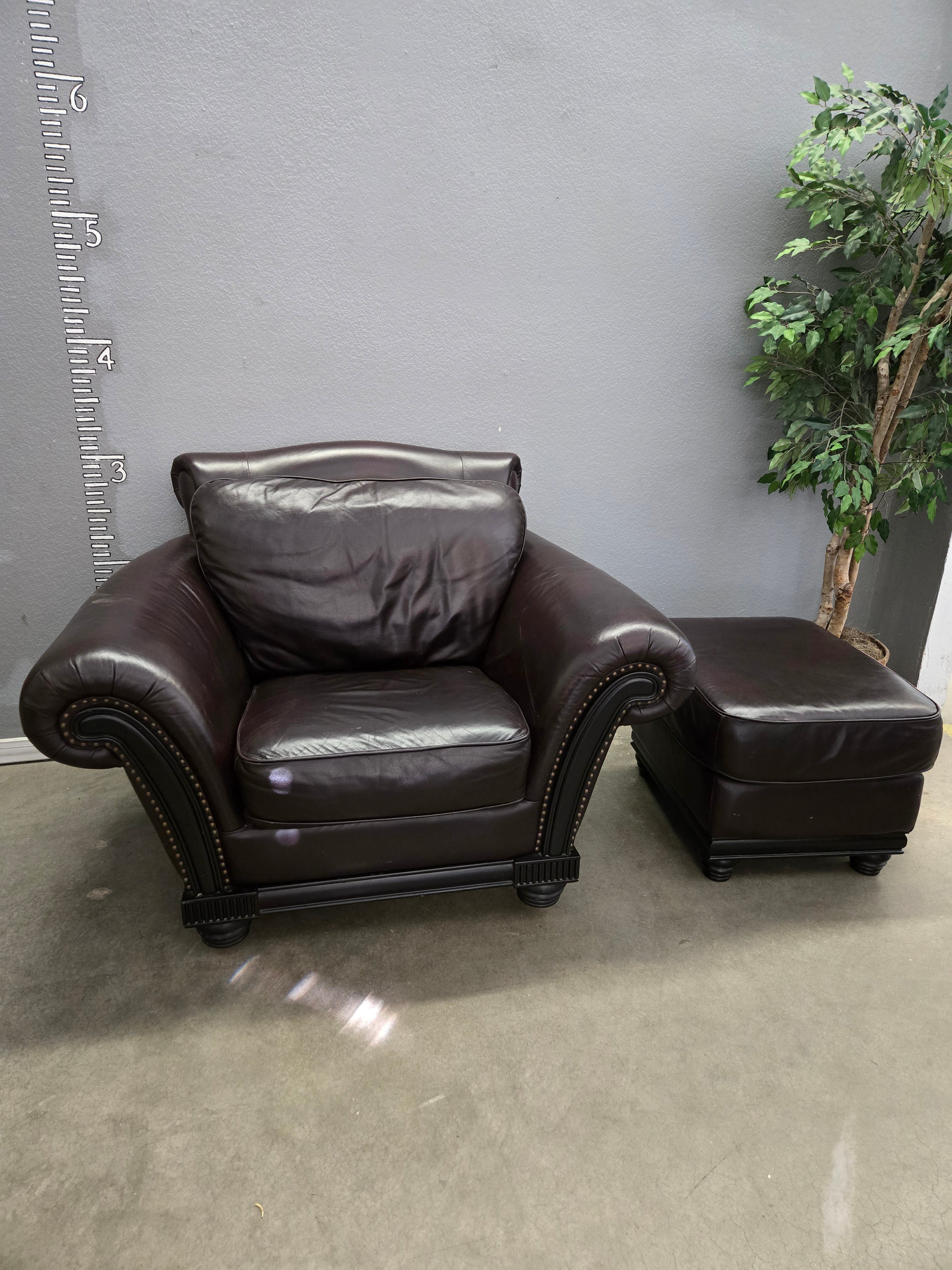 Elegant vintage armchair with matching ottoman, upholstered in rich brown leather. The armchair features a glossy finish and detailed nailhead trim that adds a touch of sophistication. Approximate Size: 3 x 4 x 3