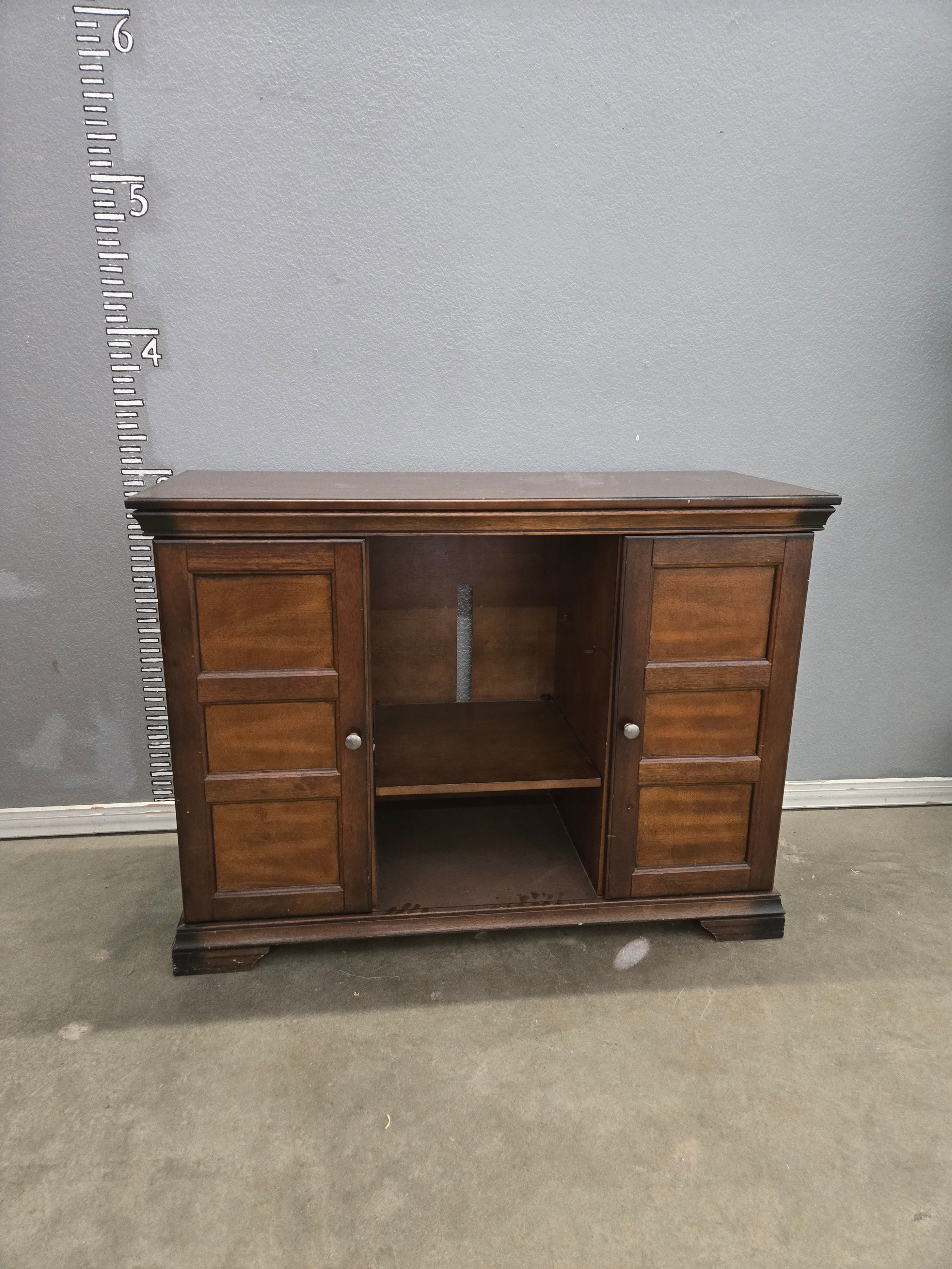 This classic wooden TV stand features a rich brown color with a smooth finish. It offers convenient storage with two cabinets and an open shelf, perfect for organizing living room electronics and accessories. Approximate Size: 3 x 4 x 1.5
