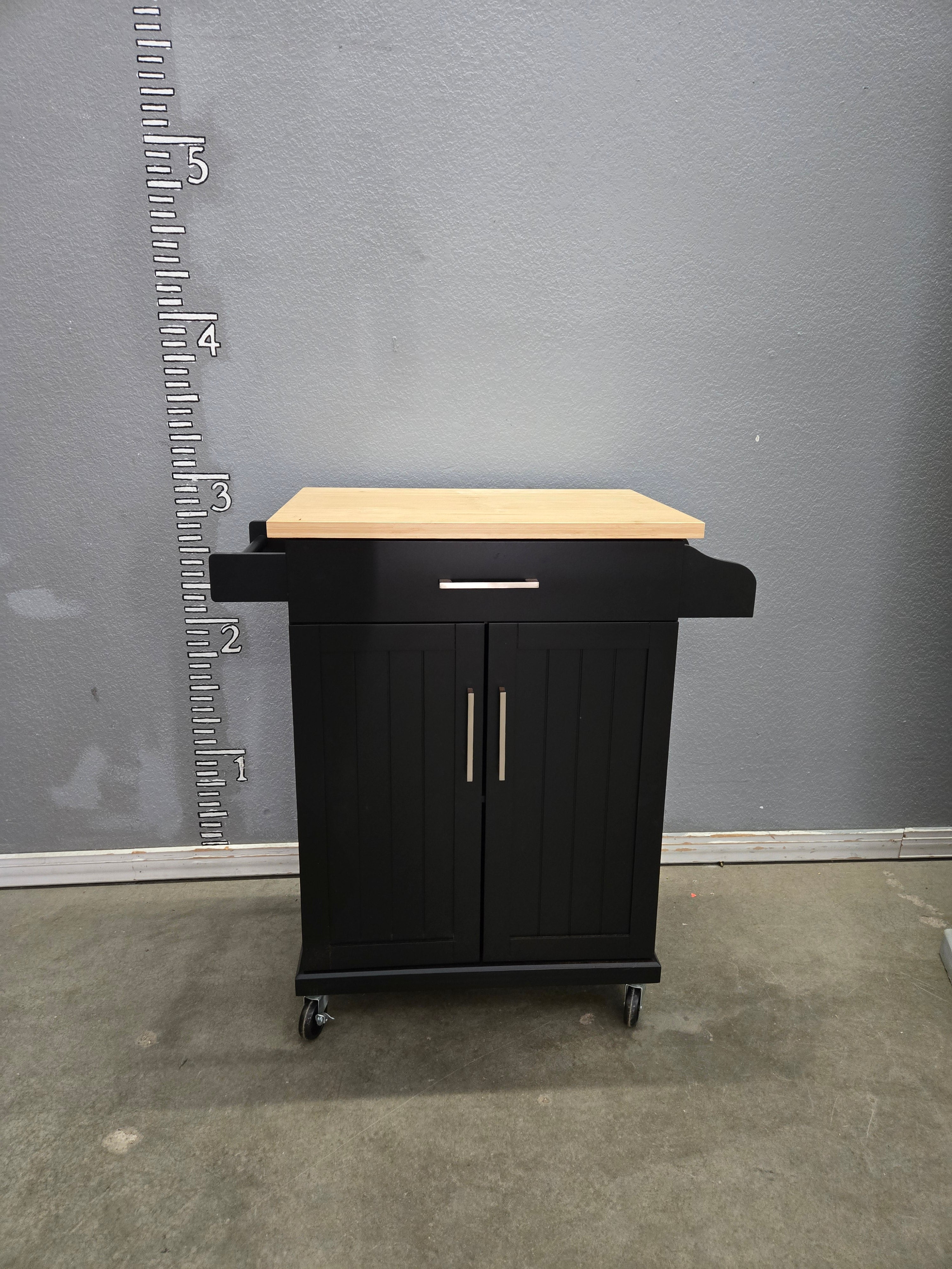 This versatile rolling kitchen island features a chic black finish with a natural wood top. Crafted with a sturdy frame, it has convenient cabinet storage below and a single drawer for utensils. The sleek design and neutral colors make it a perfect addition to any kitchen decor. Approximate Size: 3 x 2 x 1.5