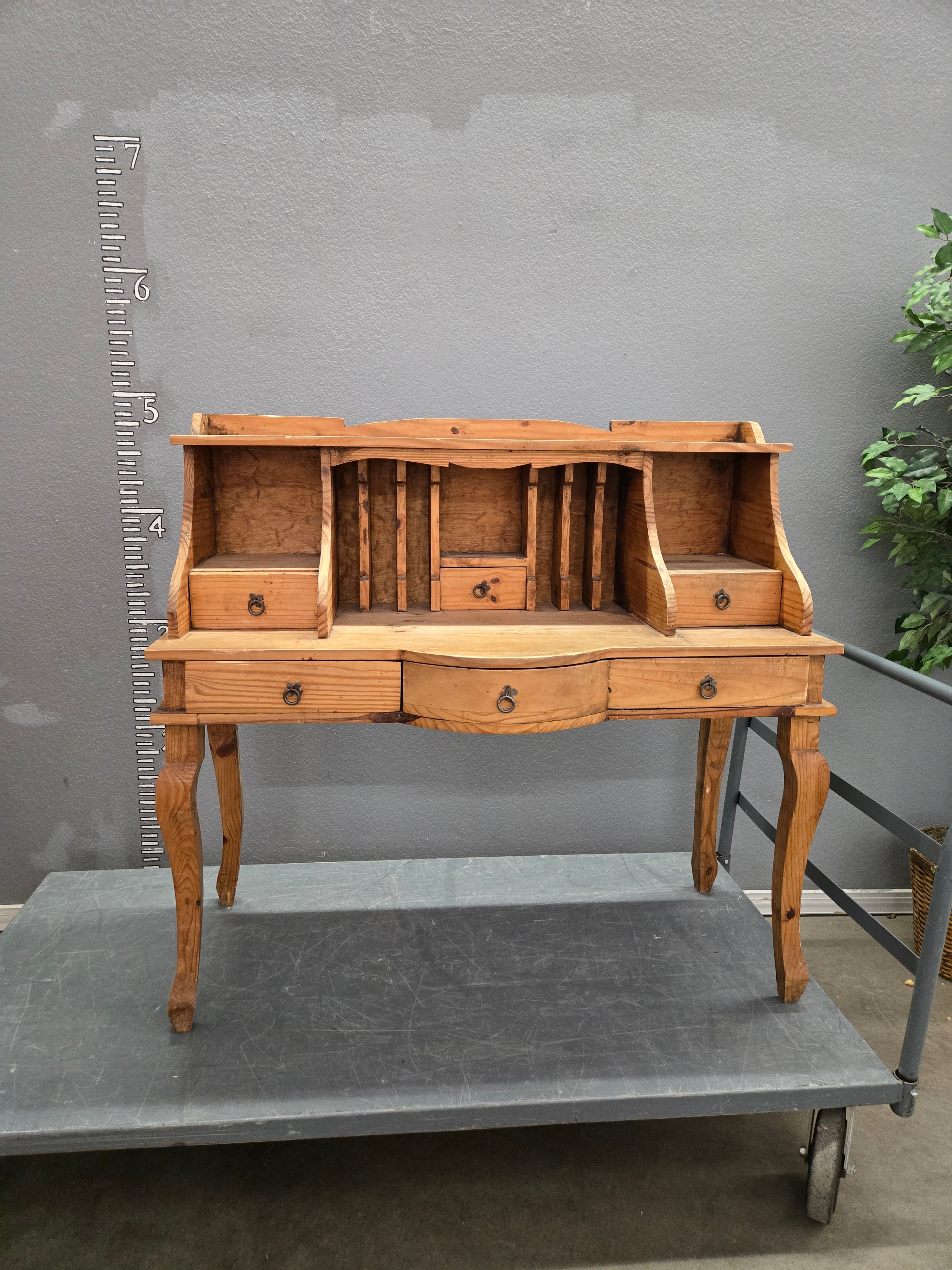 A charming vintage writing desk crafted from light-toned wood with a rustic finish. Features a hutch with cubby spaces and small drawers, perfect for organizing office supplies. Approximate Size: 4.5 x 5 x 2