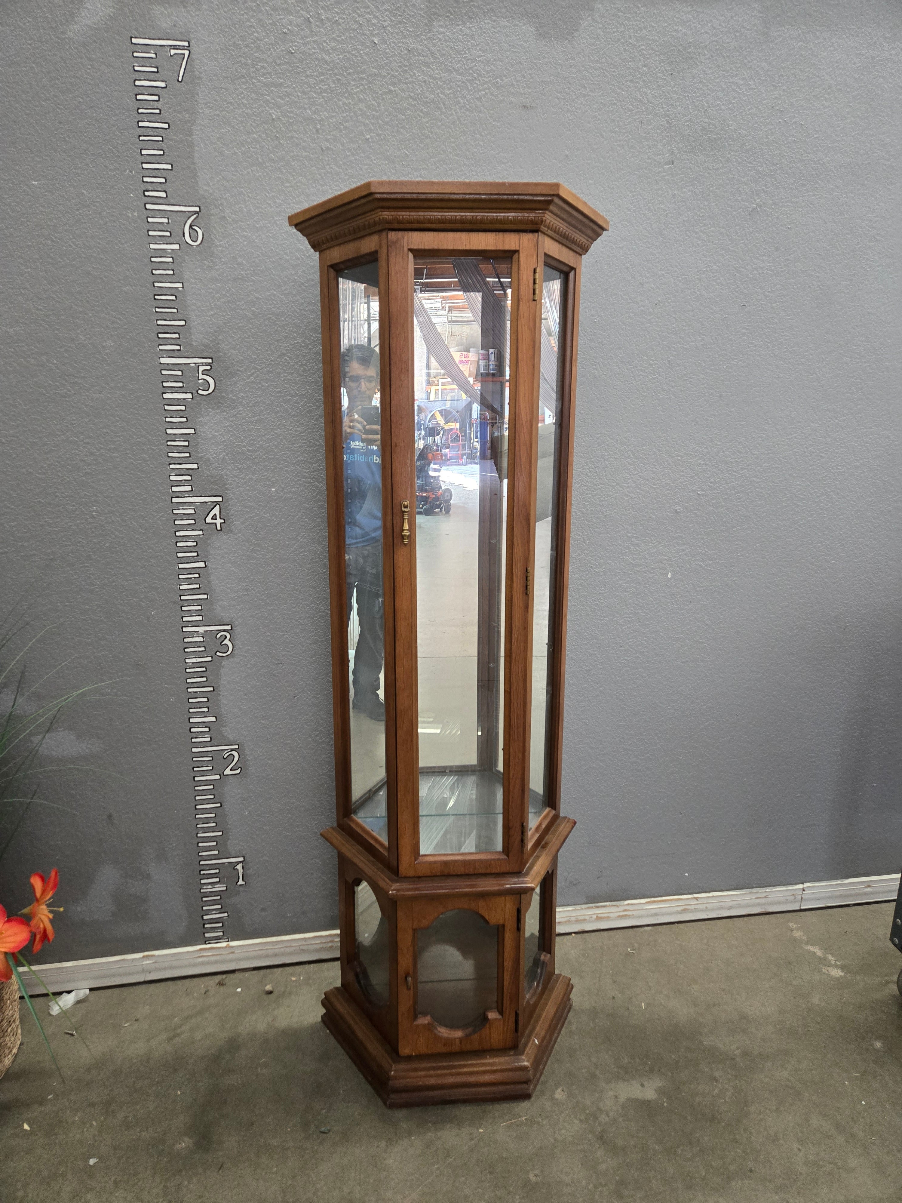 Elegant hexagonal display cabinet featuring a rich brown wood finish and clear glass panels. Perfect for showcasing collectibles, this piece adds sophistication to any room. Approximate Size: 6 x 1.5 x 1.5