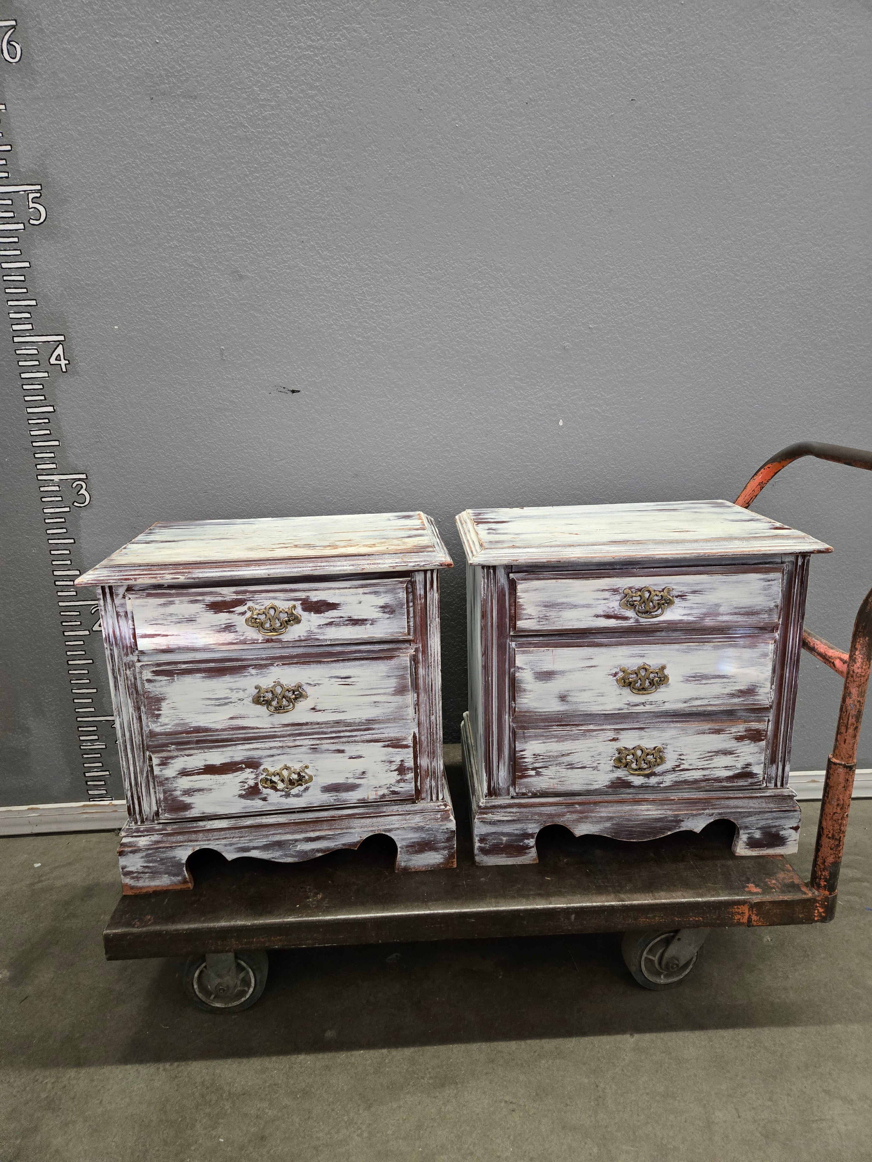 These charming nightstands feature a distressed white and brown finish, adding a rustic touch to any bedroom. Each piece is crafted with care, offering three drawers with ornate brass handles for ample storage. Approximate Size: 2.5 x 2 x 1.5