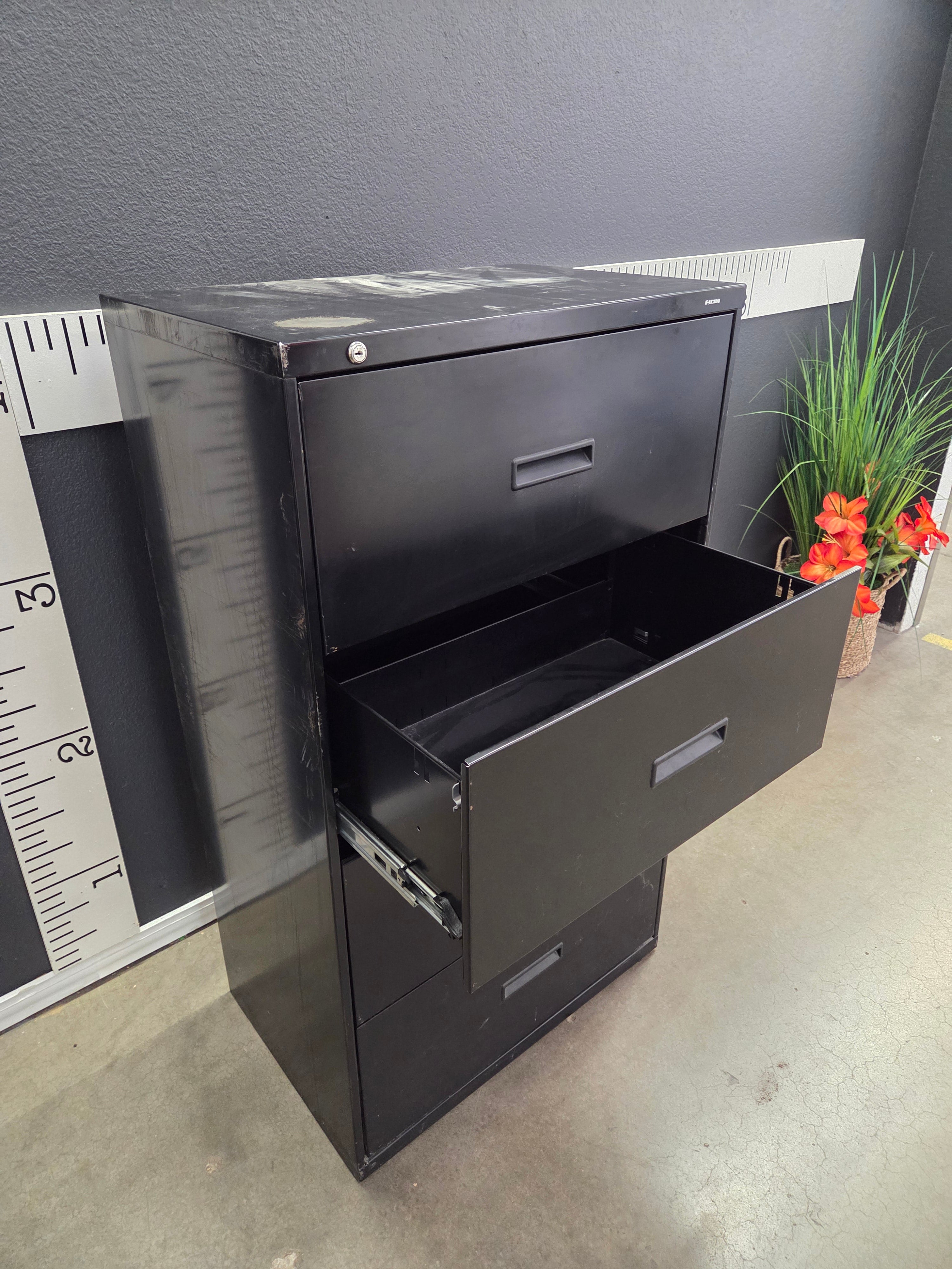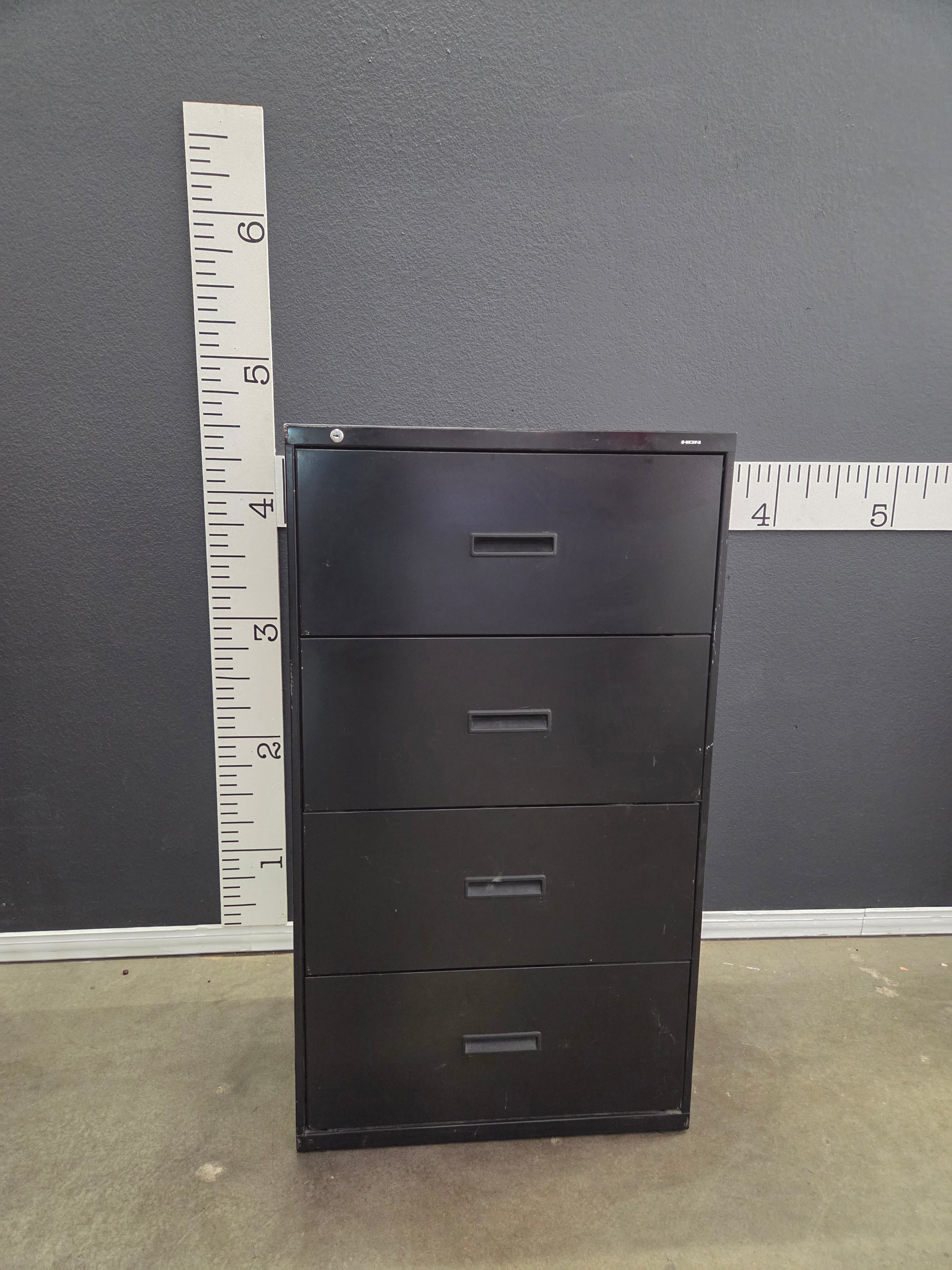 This filing cabinet features a sleek black finish with a durable metal construction, ideal for organizing office files and documents. Approximate Size: 4 x 1.5 x 2