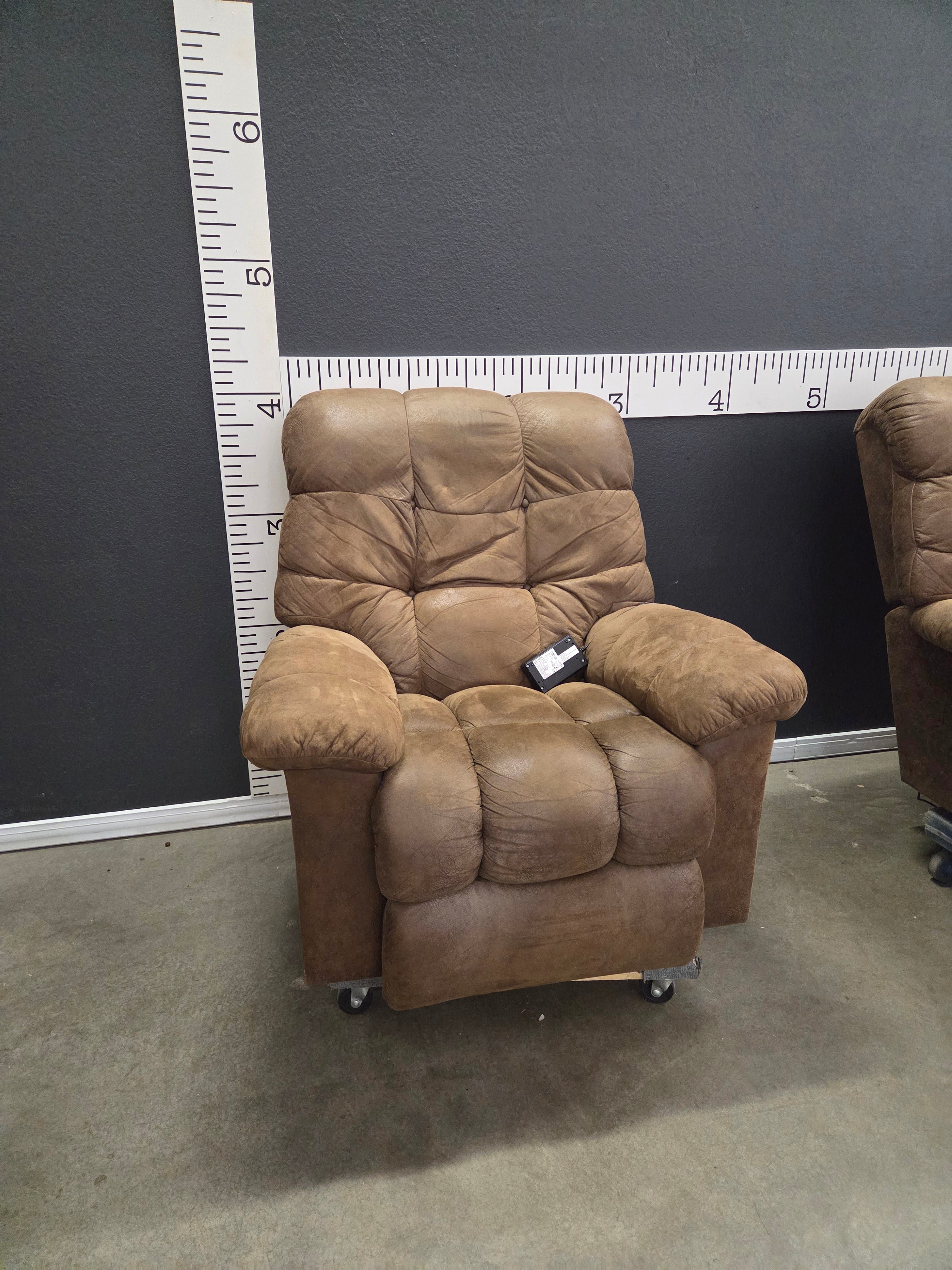 This recliner features a cozy, brown suede-like fabric with a plush finish, providing optimal comfort and relaxation. Ideal for any living room setting. Approximate Size: 4 x 3 x 3