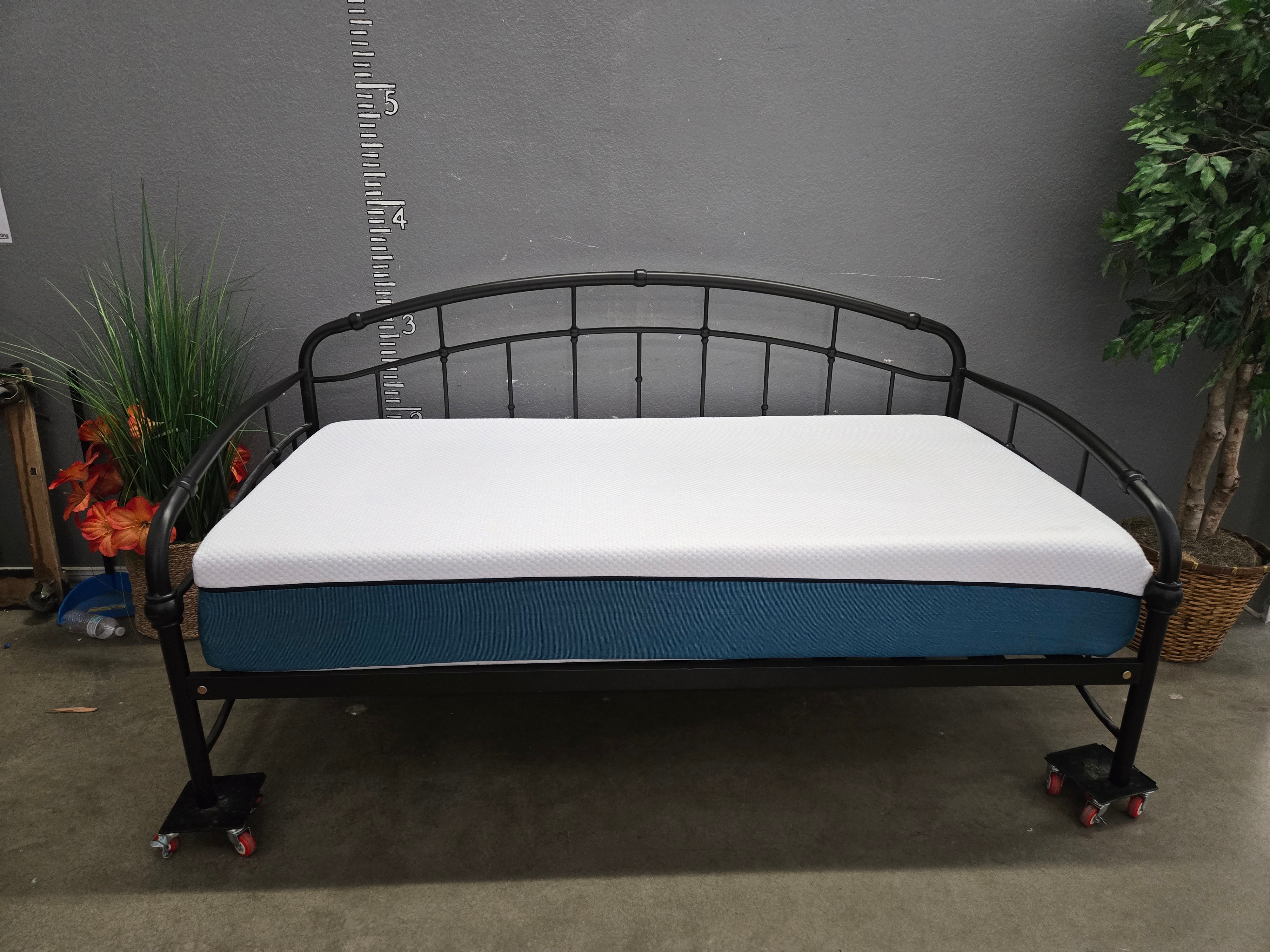 This contemporary daybed features a sleek black metal frame and includes a comfortable mattress with a white and blue fabric cover. Ideal for adding extra seating or sleeping space to a room with modern decor, it combines practicality with style. Approximate Size: 4 x 6.5 x 3