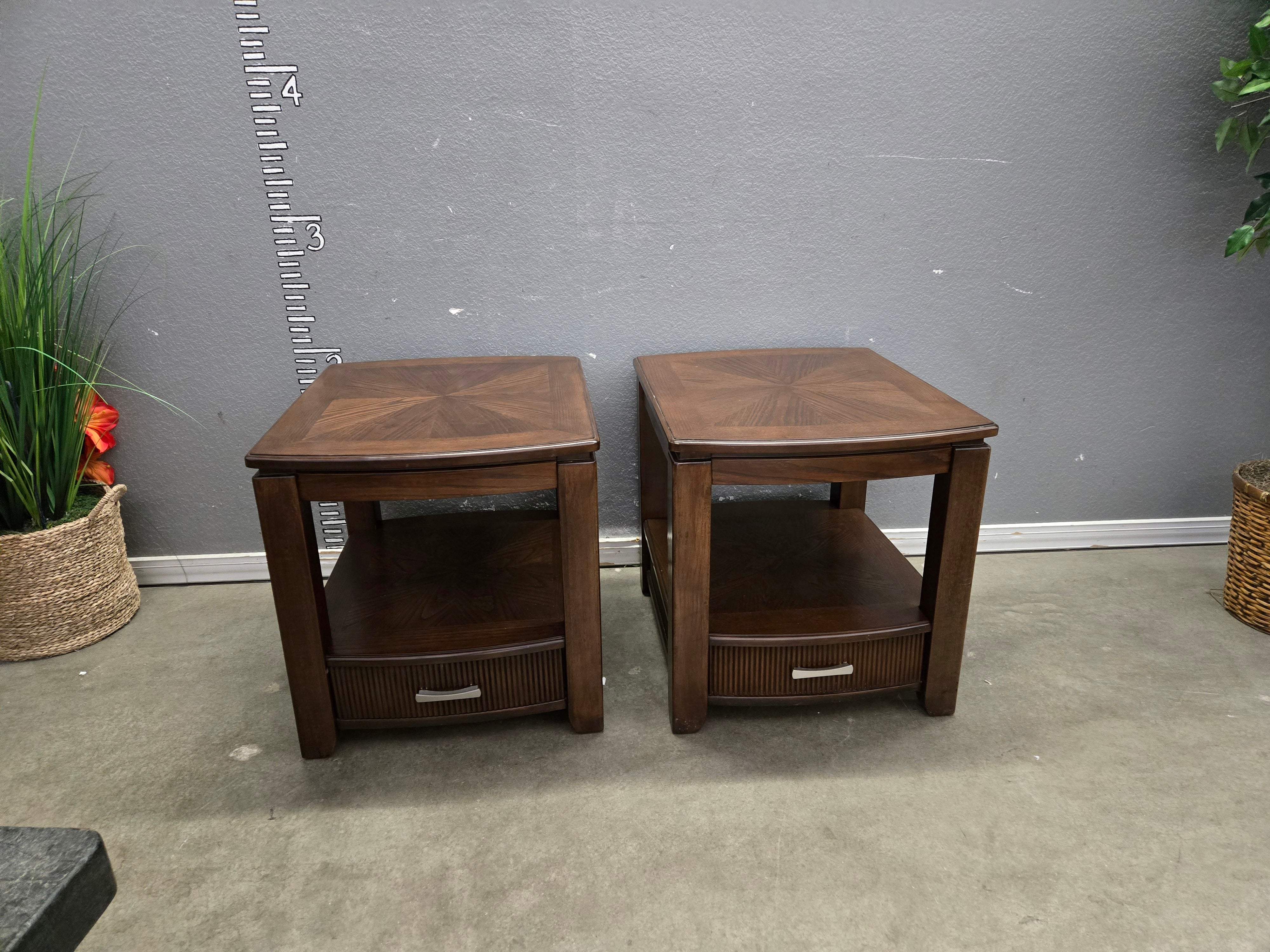 These elegant end tables feature a rich dark wood finish with a smooth, polished surface. The tables include a lower shelf for additional storage and a convenient drawer with a sleek metal handle. Perfect for adding a touch of sophistication to any living room. Approximate Size: 2 x 1.5 x 1.5
