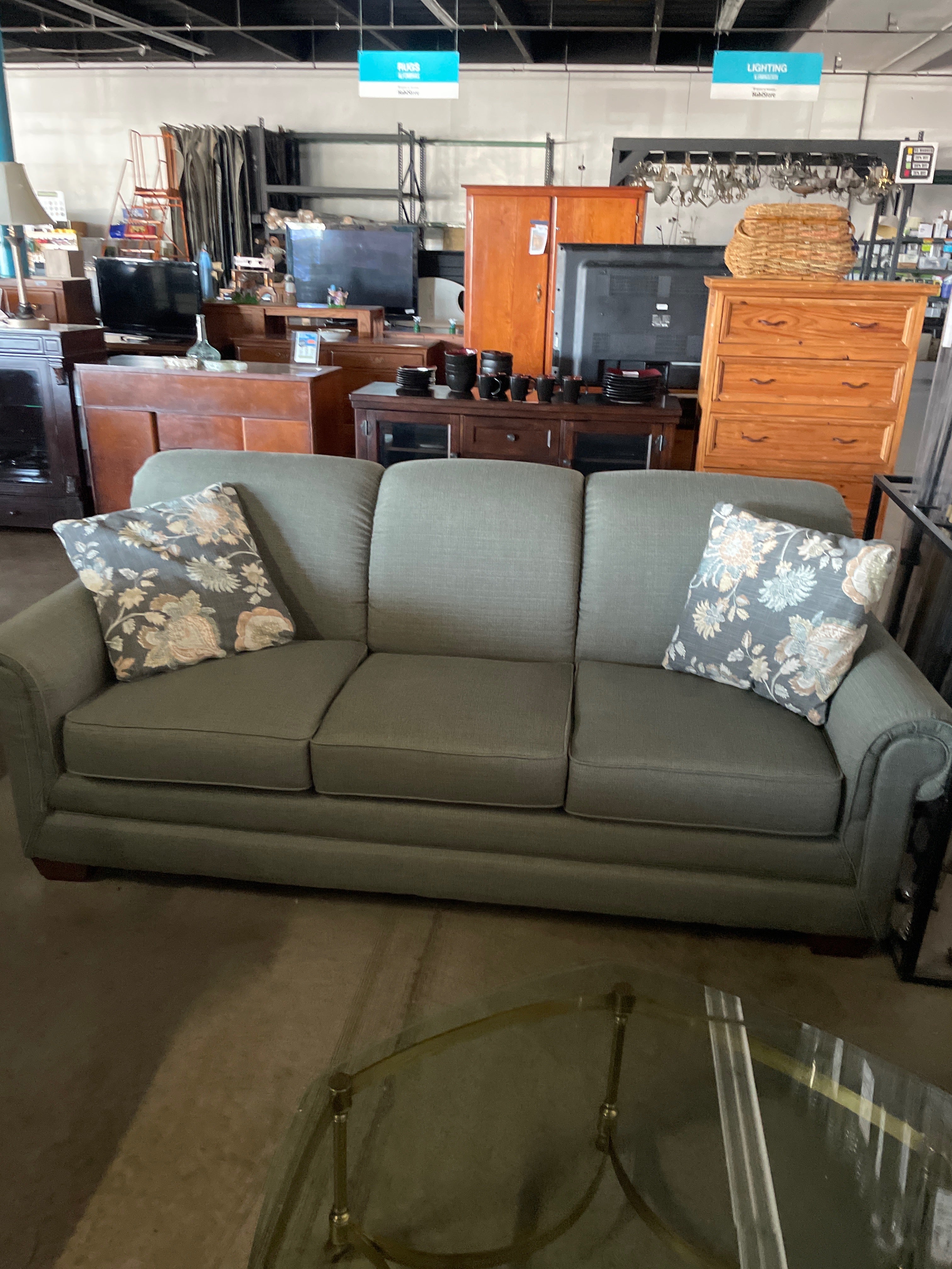 This elegant sofa features a soft, sage green fabric with a smooth finish. It includes two floral-patterned cushions for added comfort and style, perfect for any living room. Approximate Size: 3 x 7 x 3