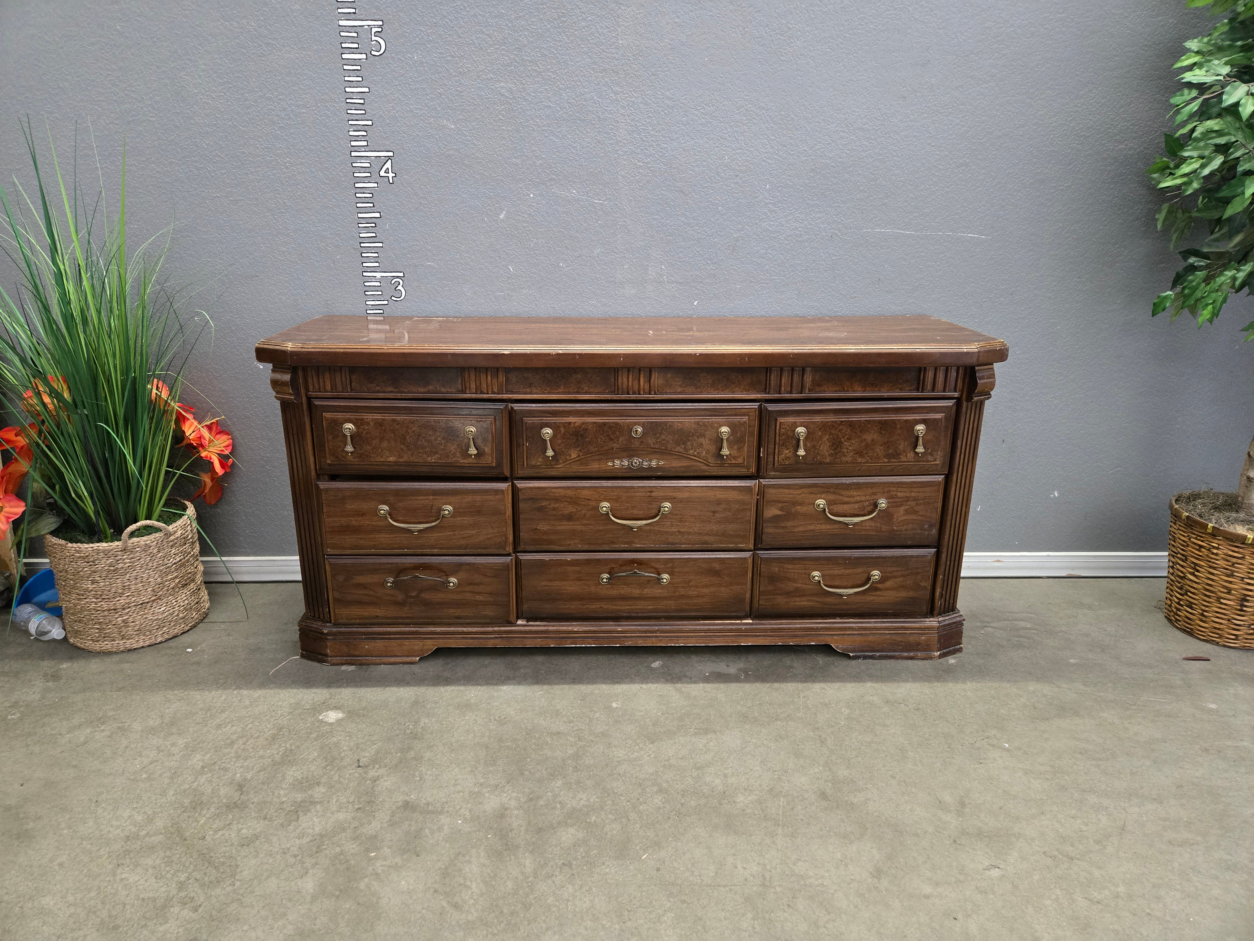 This elegant dresser is crafted from rich, dark wood with a smooth finish. It features nine drawers with brass handles, offering a classic look that enhances any room decor. Approximate Size: 2.5 x 5 x 1.5