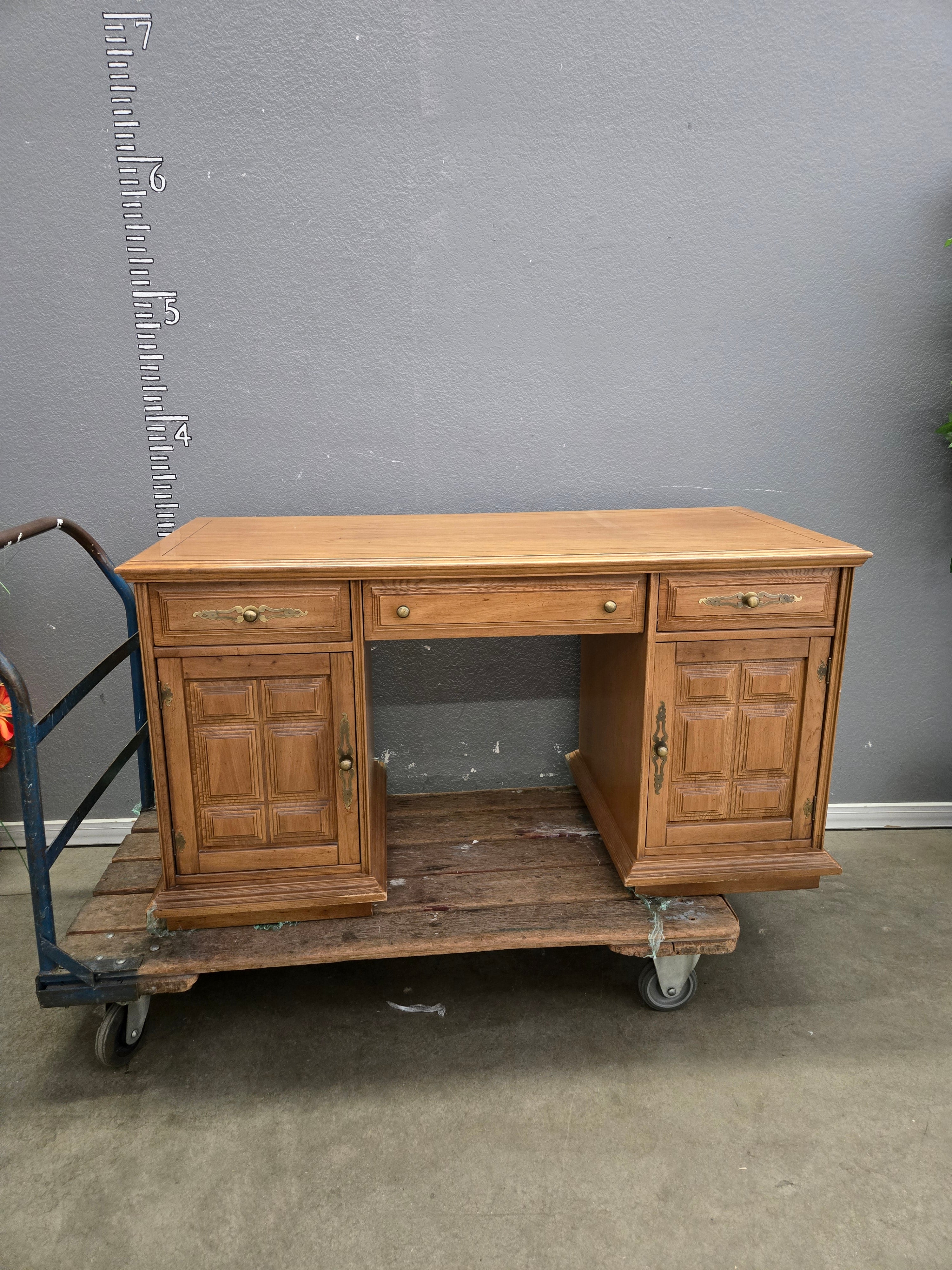 This is a vintage wooden office desk featuring a classic brown finish with elegant brass hardware. The desk includes a central drawer and two compartments with detailed paneling, providing ample storage space. Approximate Size: 2.5 x 5 x 2