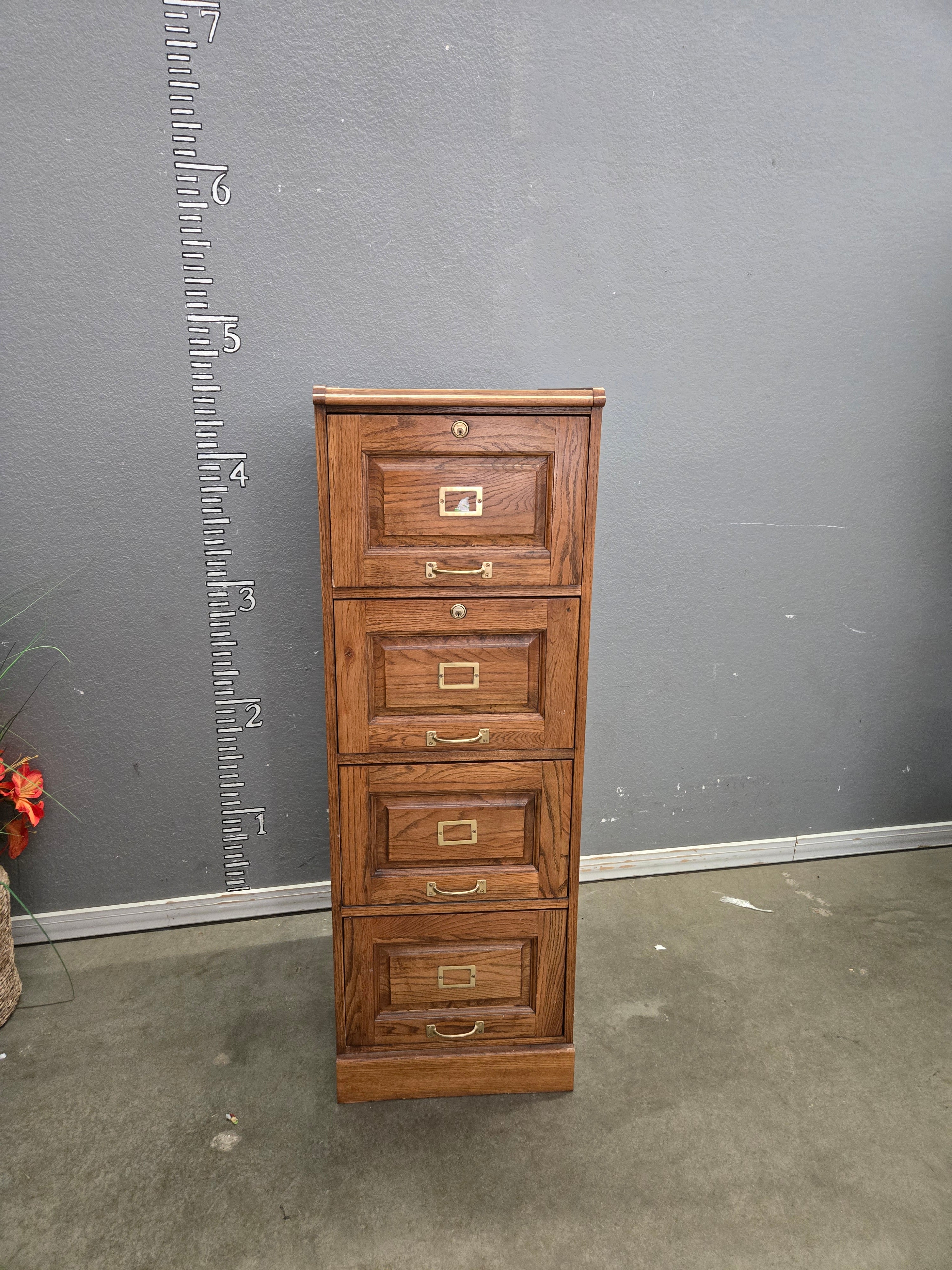 This vintage file cabinet is crafted from solid oak wood, featuring a rich brown color with a classic wood grain finish. It includes elegant brass handles for a distinct antique look. Approximate Size: 4 x 1.5 x 1.25