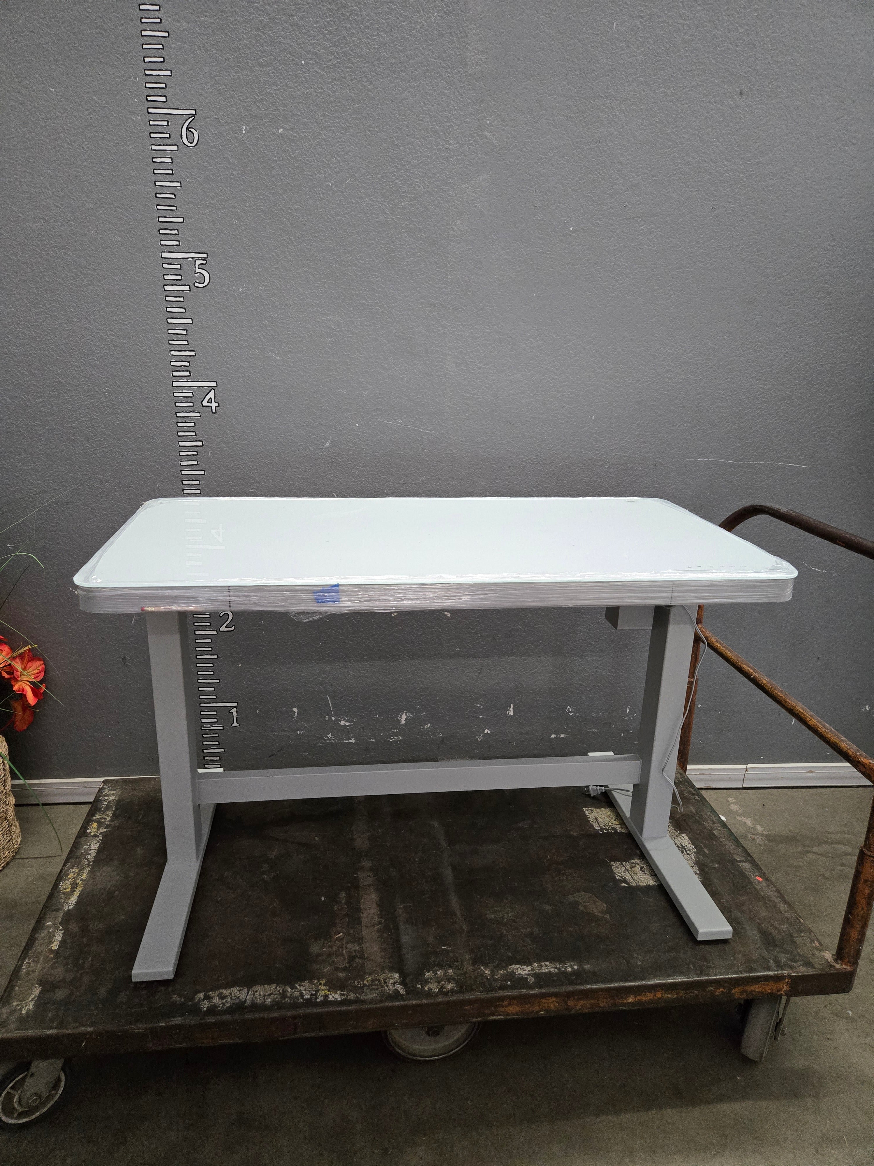 This sleek, adjustable office desk features a modern white finish with a smooth surface. The sturdy metal frame ensures stability and durability, making it an ideal choice for any workspace. Approximate Size: 3 x 4 x 2