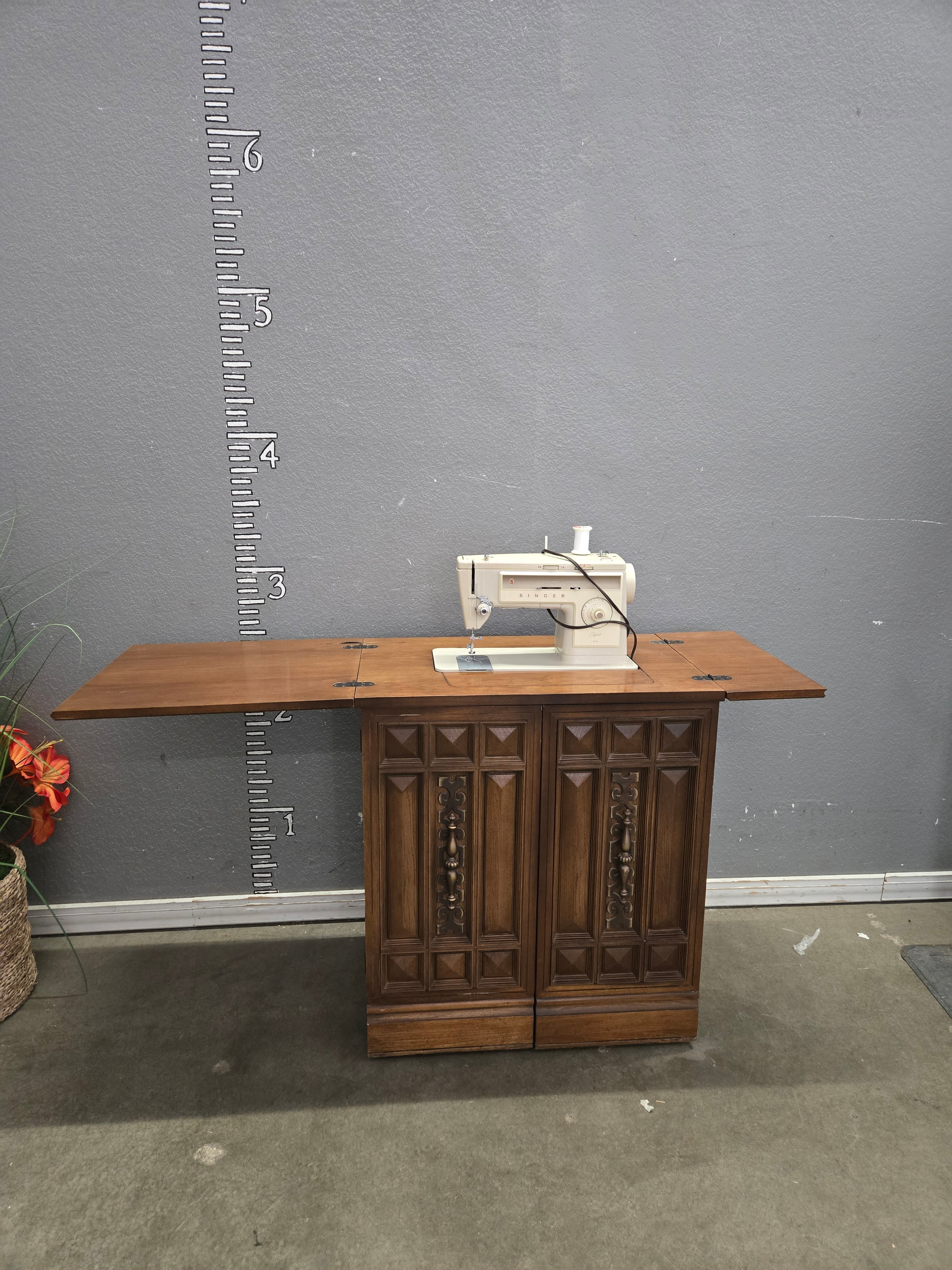 This classic vintage sewing machine cabinet features a rich brown wood finish with decorative front panels. The fold-out table provides ample workspace, making it both stylish and functional. Approximate Size: 3 x 4 x 2