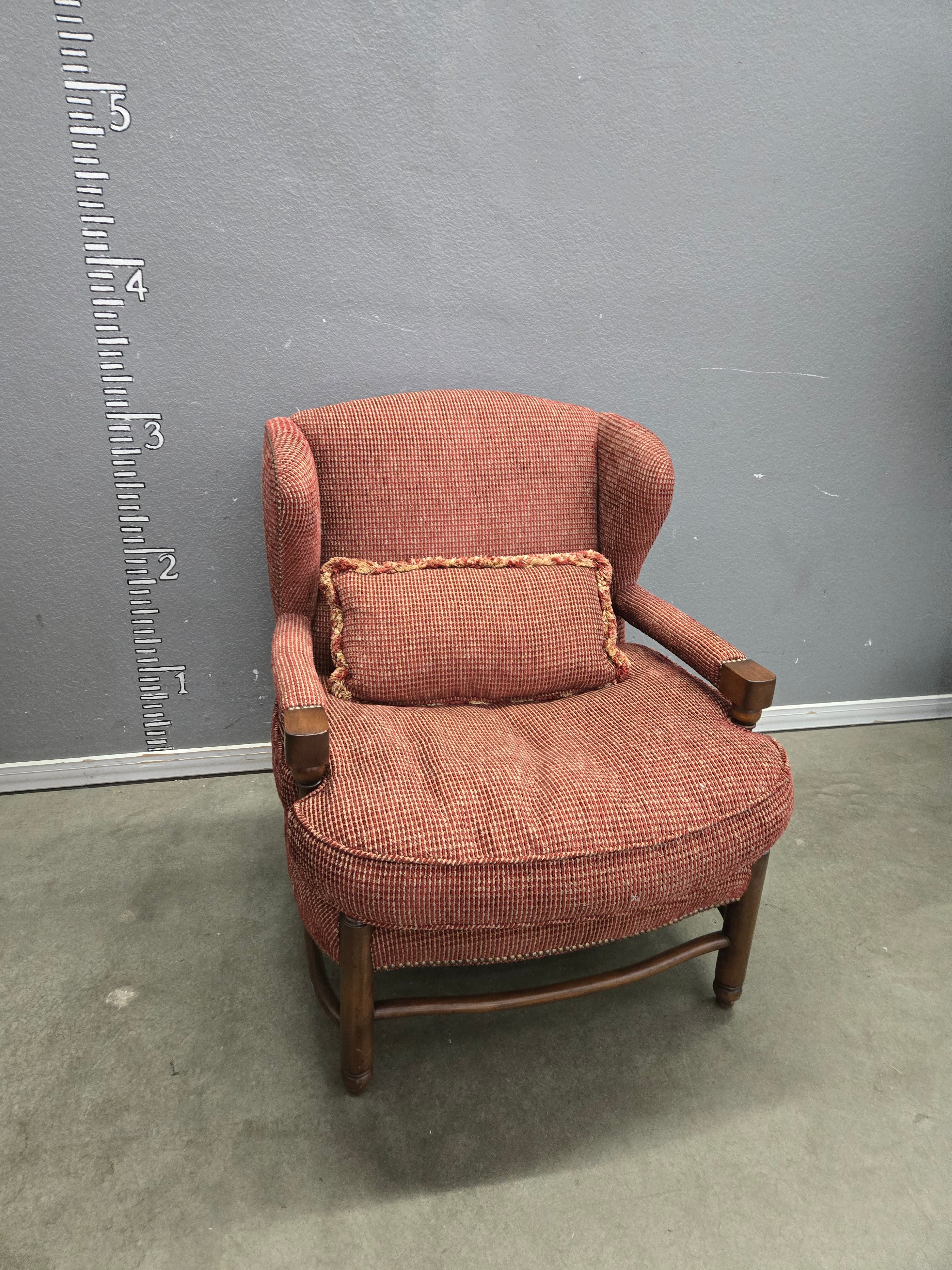 Cozy and classic armchair featuring a red fabric upholstery with a textured finish. The wooden legs offer stability and a timeless appeal, perfect for complementing any living room decor. Approximate Size: 3.5 x 2.5 x 2