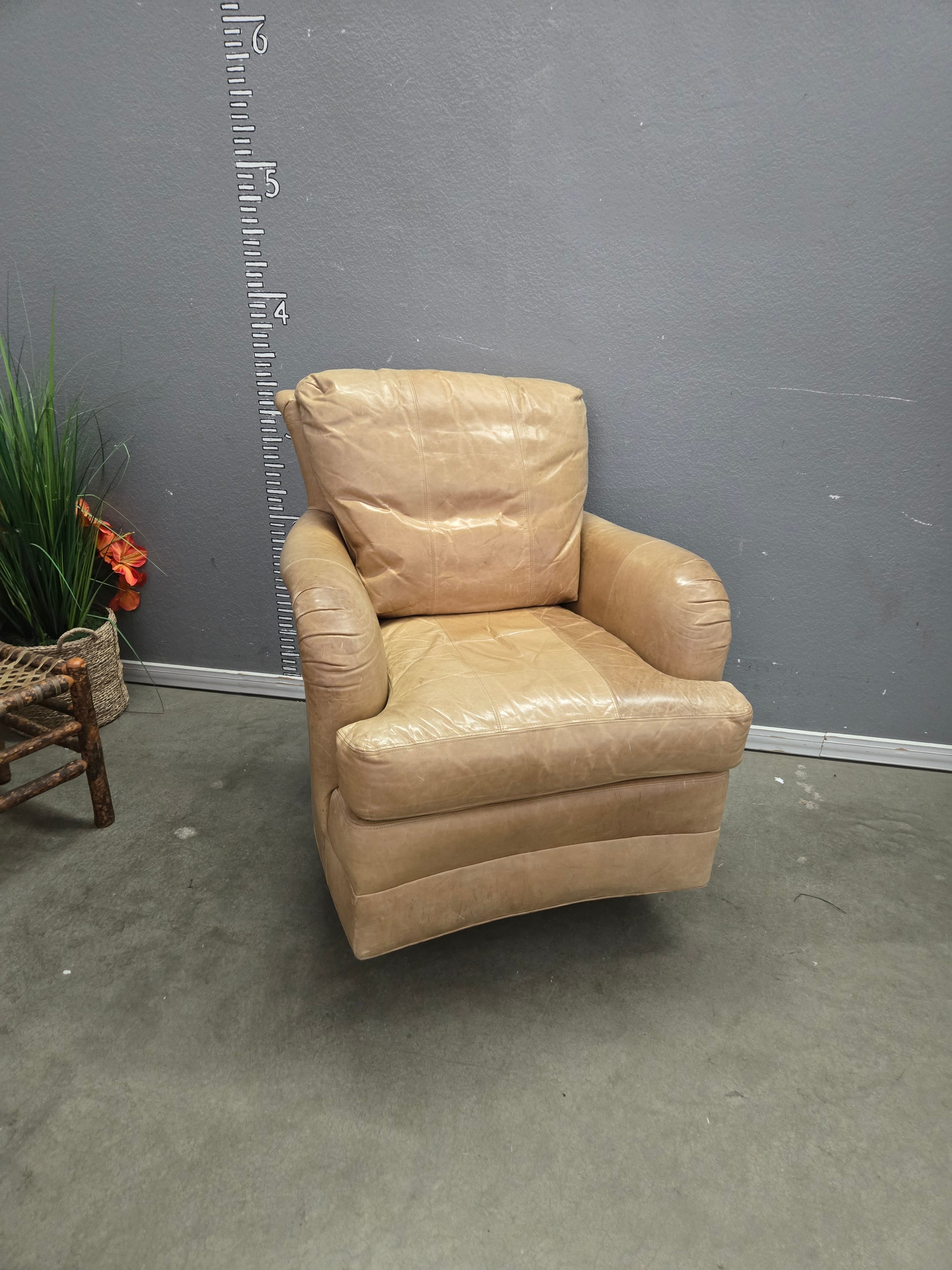 This vintage armchair features a warm tan leather finish, offering a comfortable and stylish addition to any living room. The worn leather provides a soft seating experience, perfect for relaxation. Approximate Size: 3 x 2.5 x 2.5