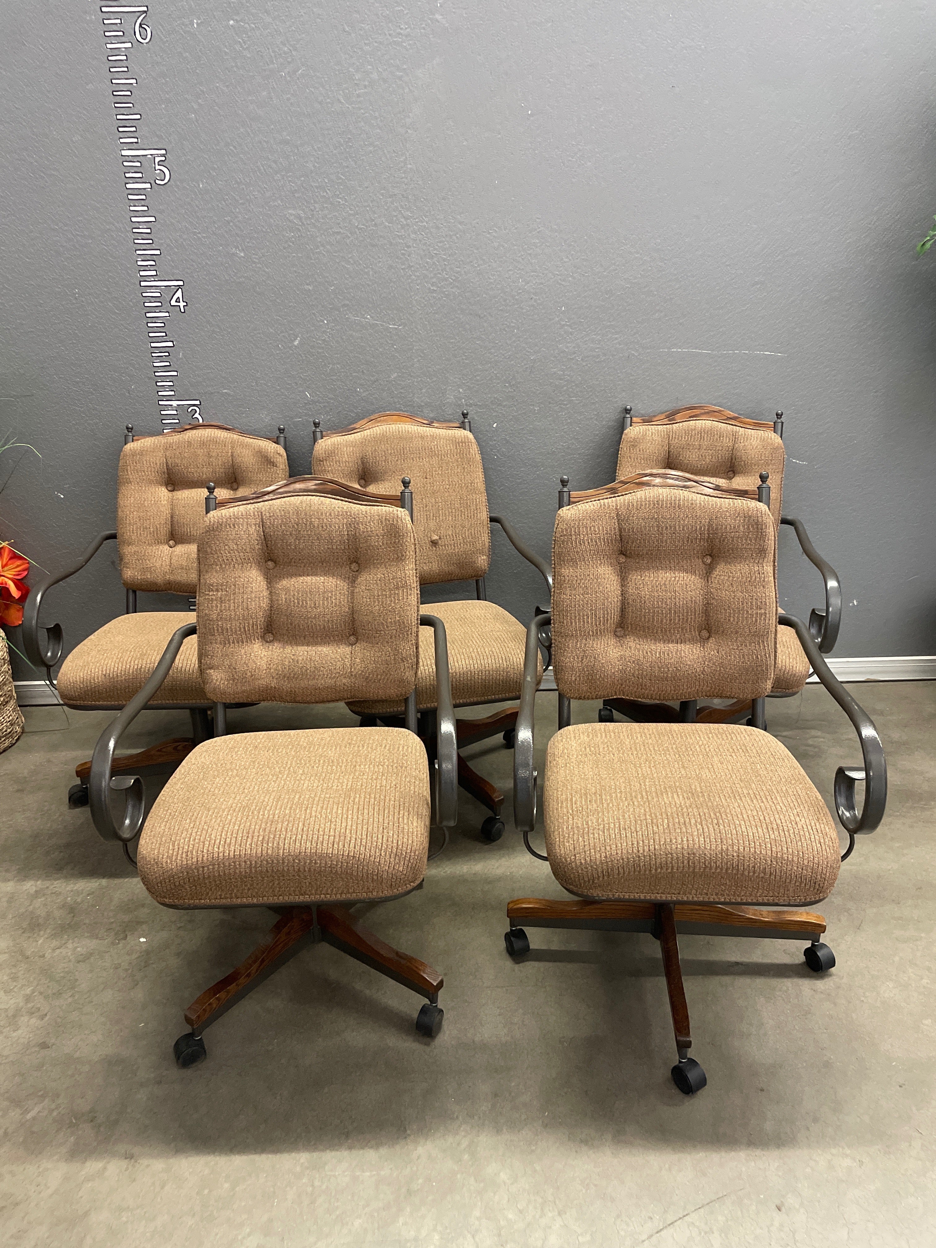 This collection features six vintage swivel chairs with a warm beige upholstery and a subtle textured fabric finish. The sturdy metal frames and wood accents add a classic touch to any space. Approximate Size: 4 x 2 x 2