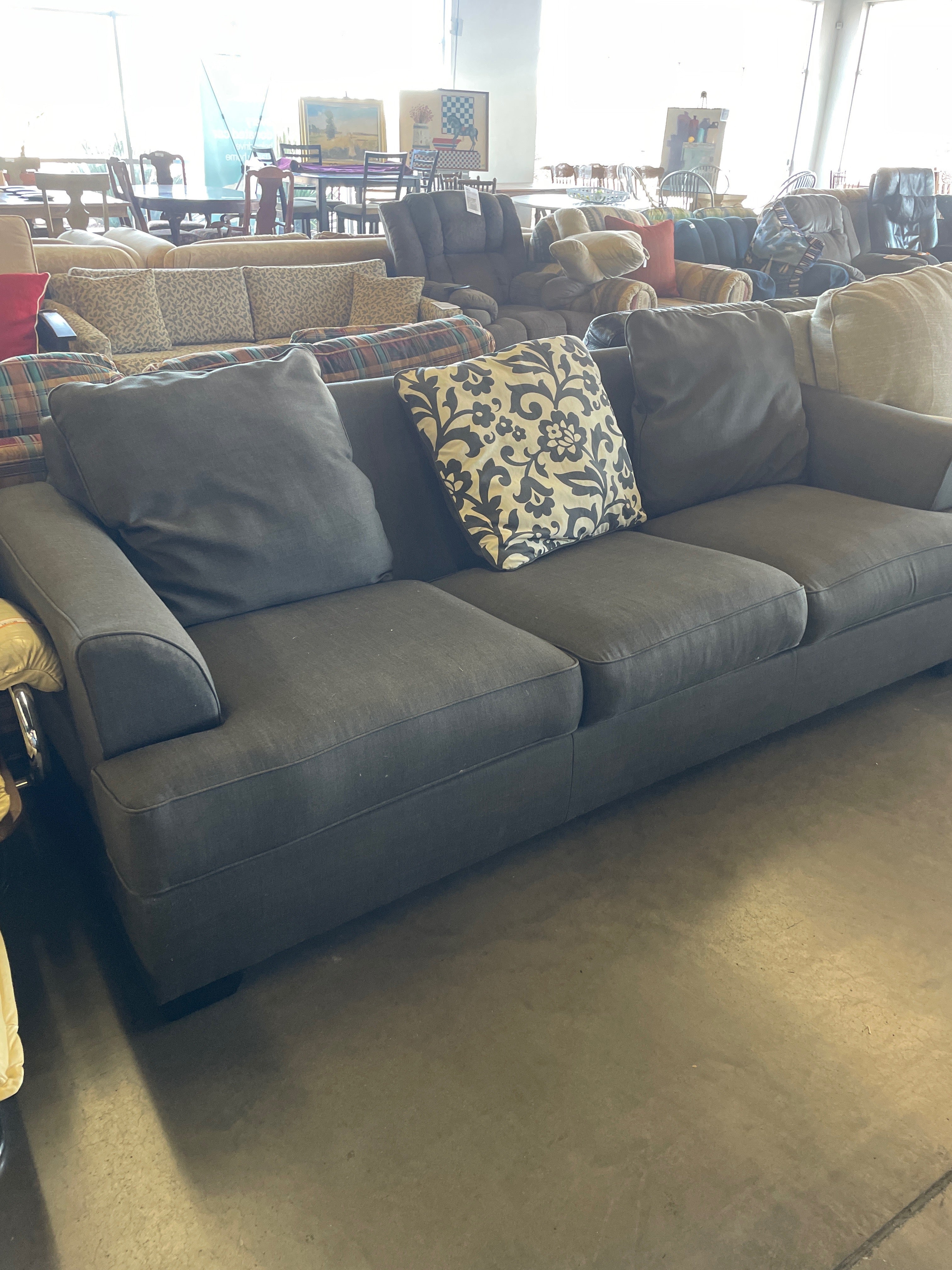 This contemporary sofa features a sleek charcoal gray finish with a soft fabric upholstery. It comes with a stylish black and white patterned accent pillow, perfect for enhancing any living space with a modern touch. Approximate Size: 3 x 7 x 3