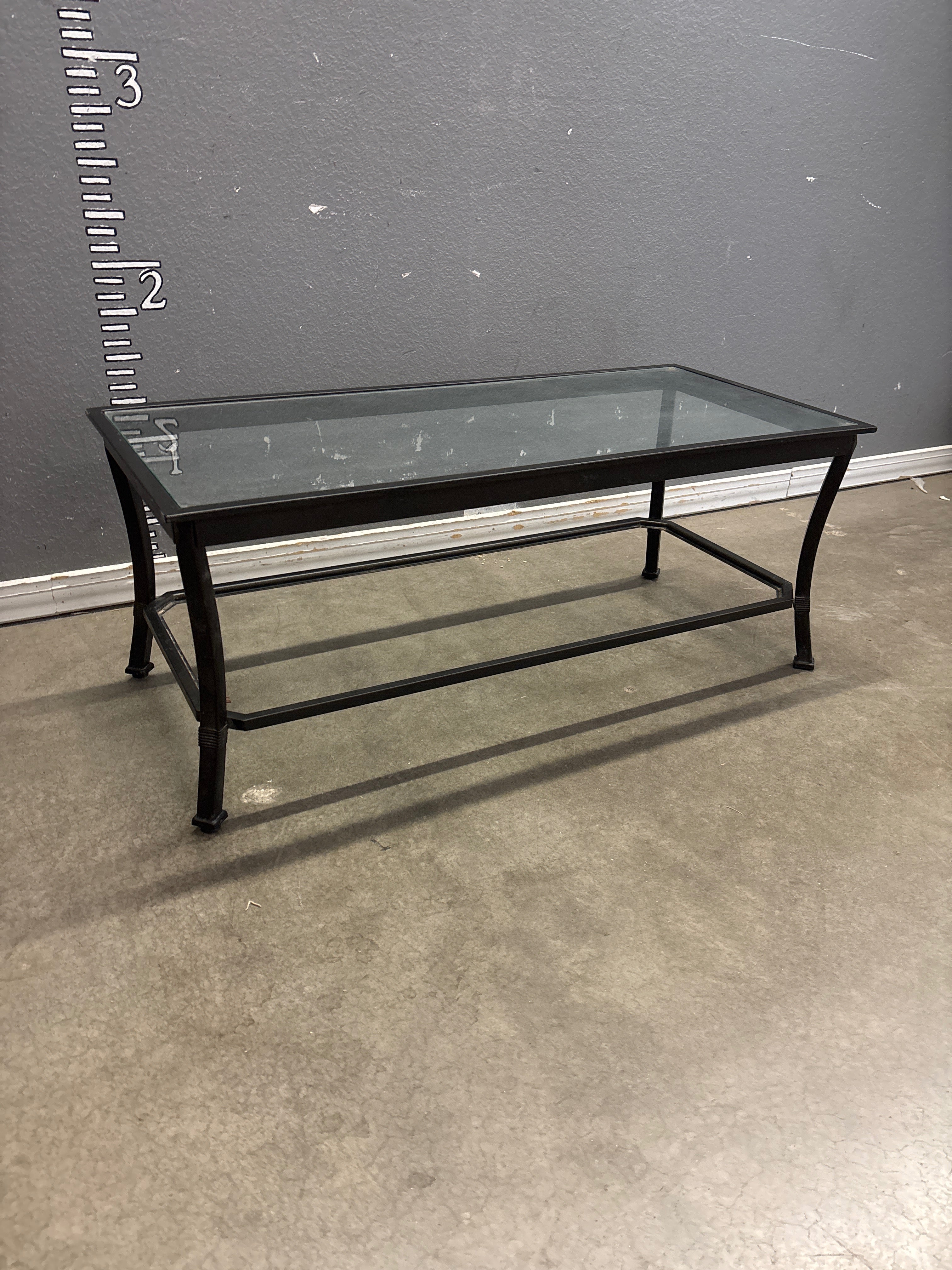 This sleek coffee table features a clear glass top and a sturdy black metal frame with a matte finish. Its contemporary design adds a modern touch to any living space. Approximate Size: 1.5 x 3 x 2