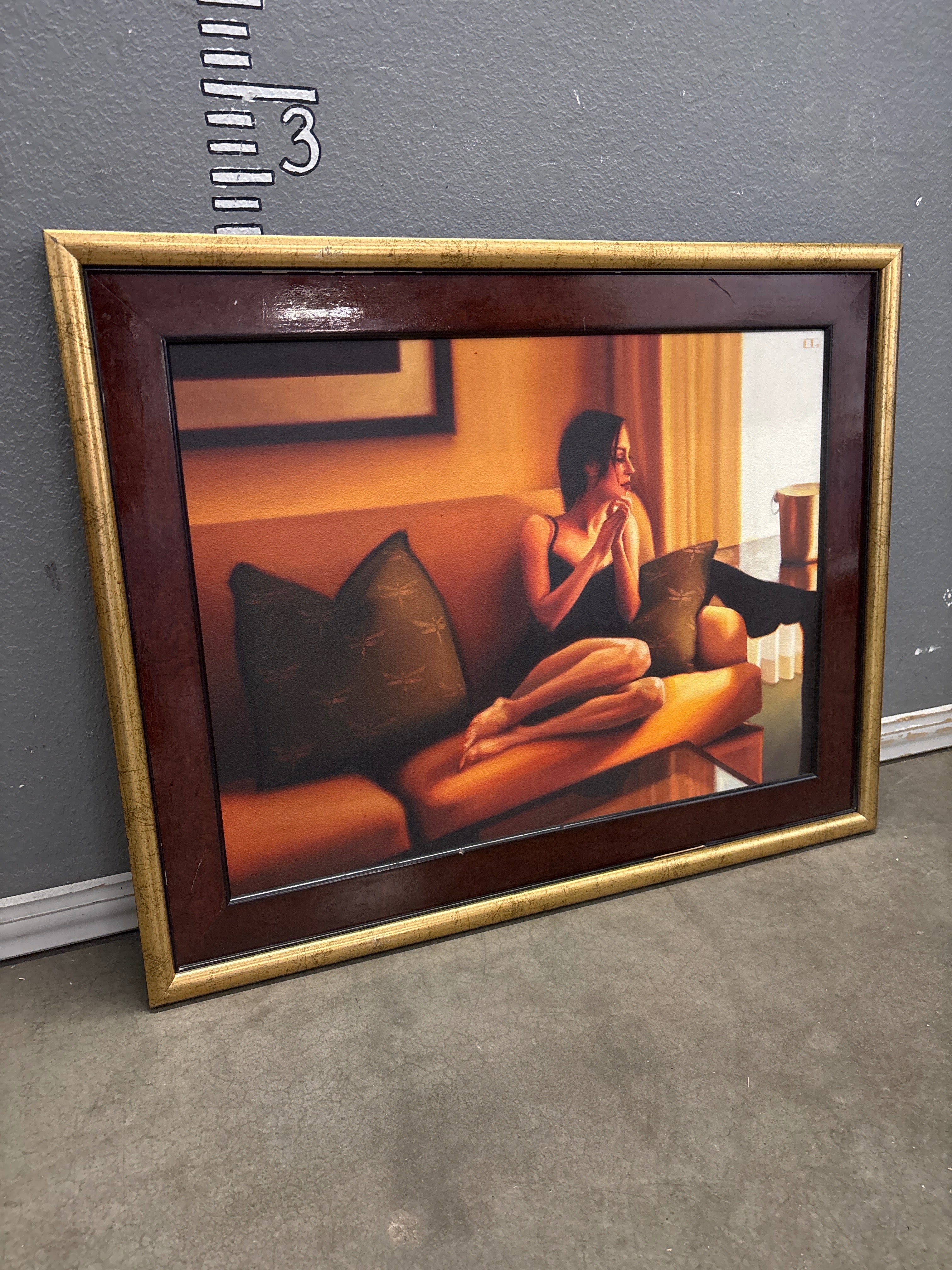 This art print features a warm-toned scene, framed in a textured gold and dark brown wooden frame with a glossy finish. Approximate Size: 2 x 3 x 0.1