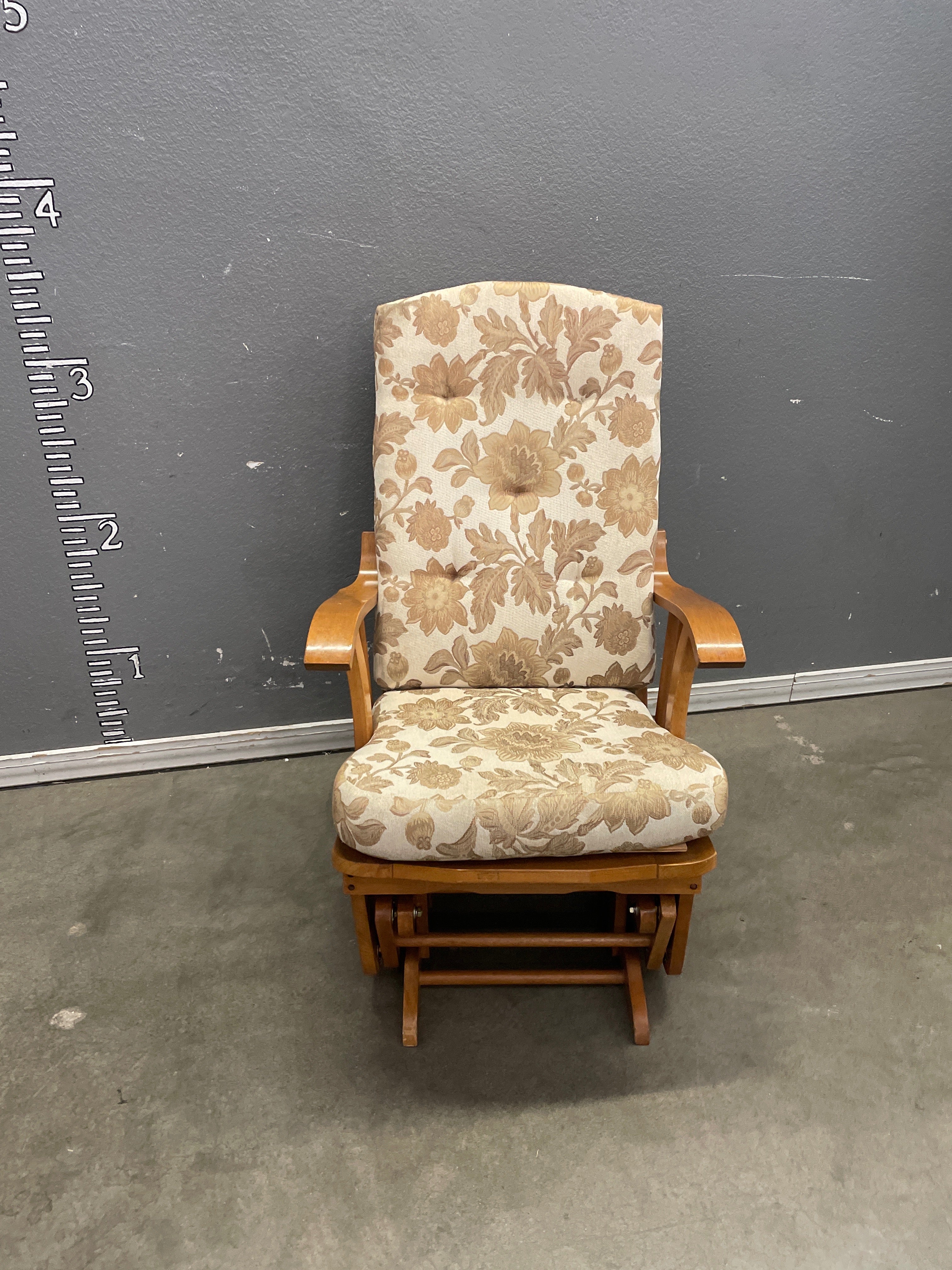 This rocking chair features a warm wooden frame with a comfortable seat and backrest upholstered in a floral pattern with beige and brown tones. The fabric has a soft finish, providing both style and comfort. Approximate Size: 3.5 x 2 x 2