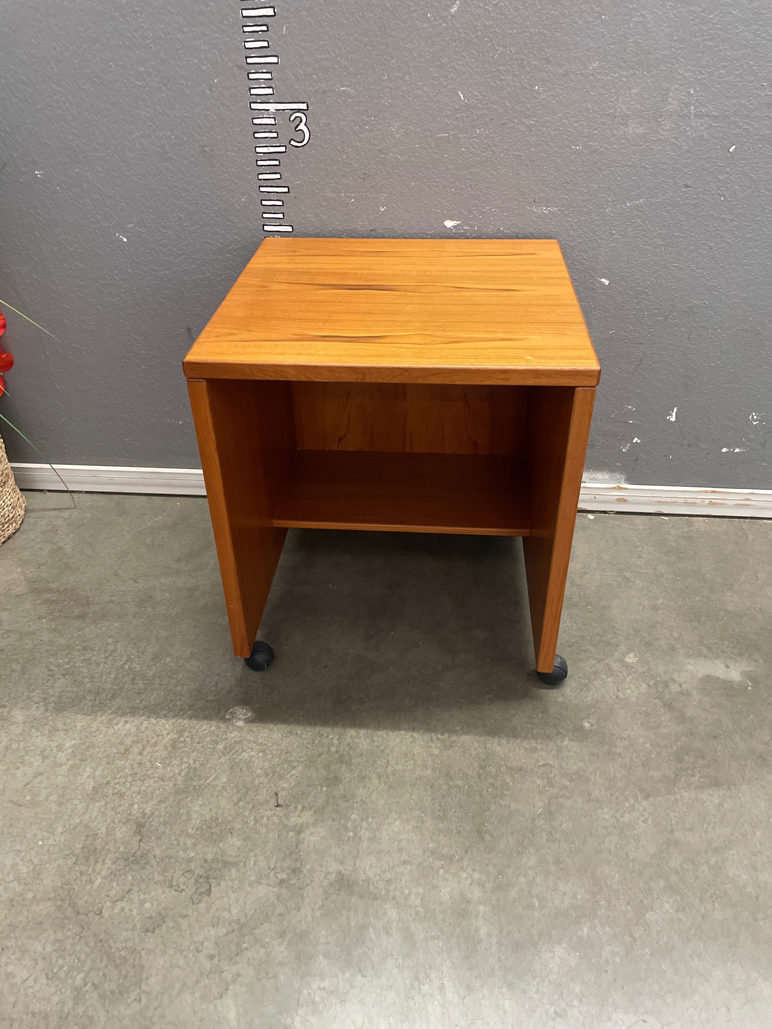 This vintage side table features a warm, natural wood finish, adding an inviting touch to any room. The table is equipped with wheels for easy mobility and includes a convenient open shelf for storage. Approximate Size: 2.5 x 1.5 x 1.5
