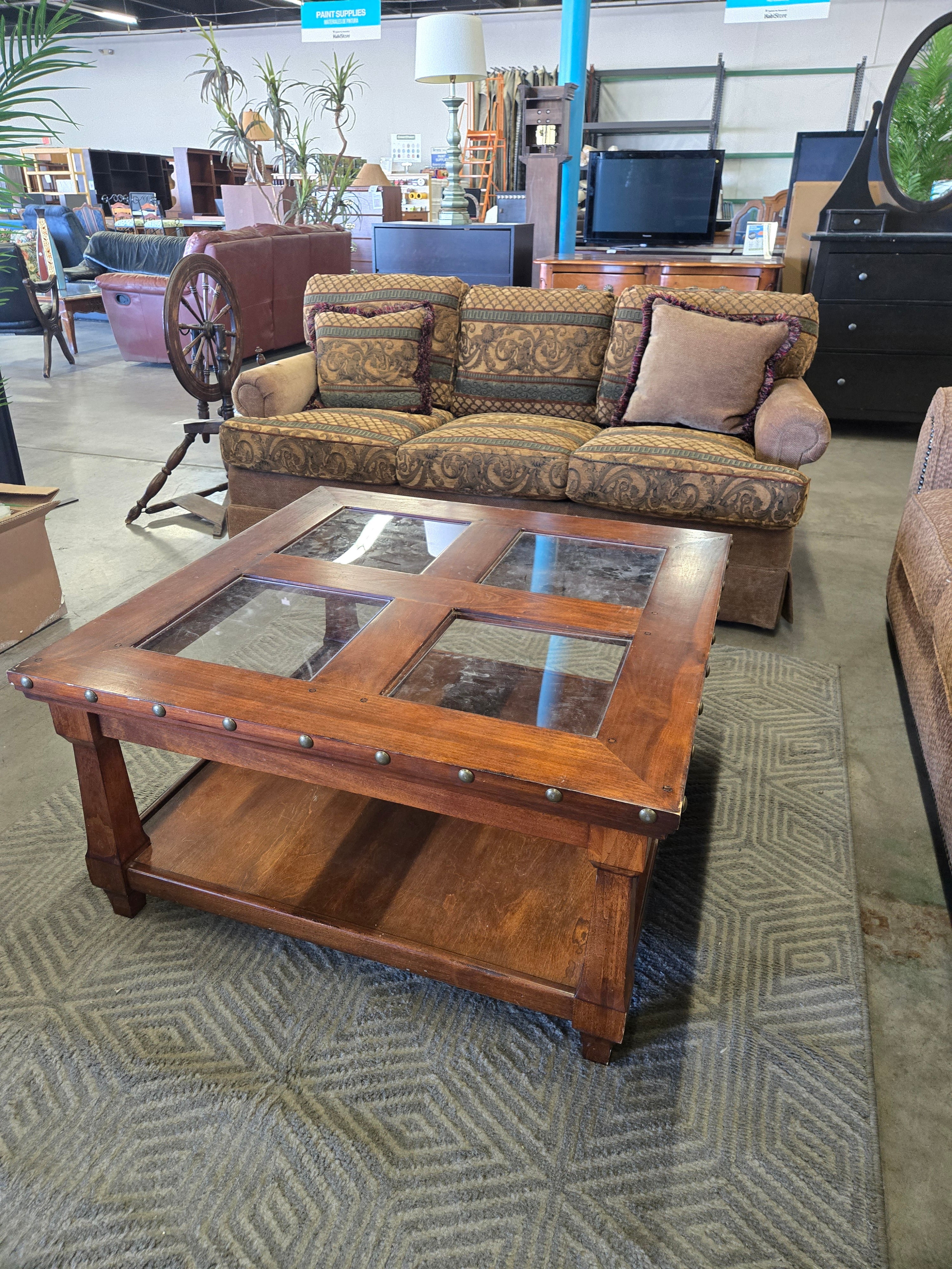 Elegant wooden coffee table featuring a rich brown finish with a glass inlay top. The table is accented with metal rivets for a rustic touch, complementing various décor styles. Approximate Size: 1.5 x 4 x 4