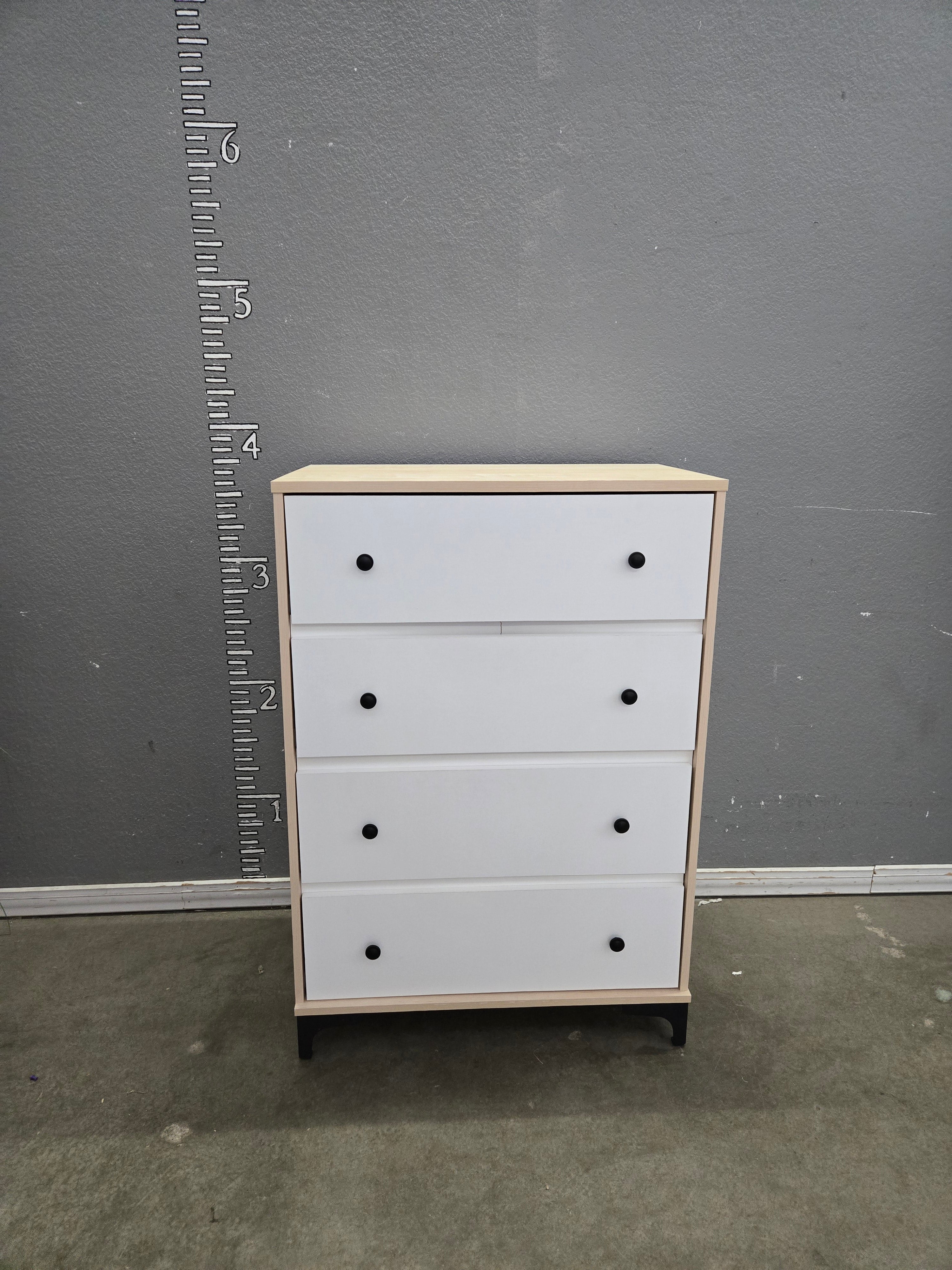 This sleek dresser features a smooth white finish combined with natural wood accents and simple black knobs. Ideal for a contemporary look in your bedroom or living room. Approximate Size: 3.5 x 2.5 x 1.5