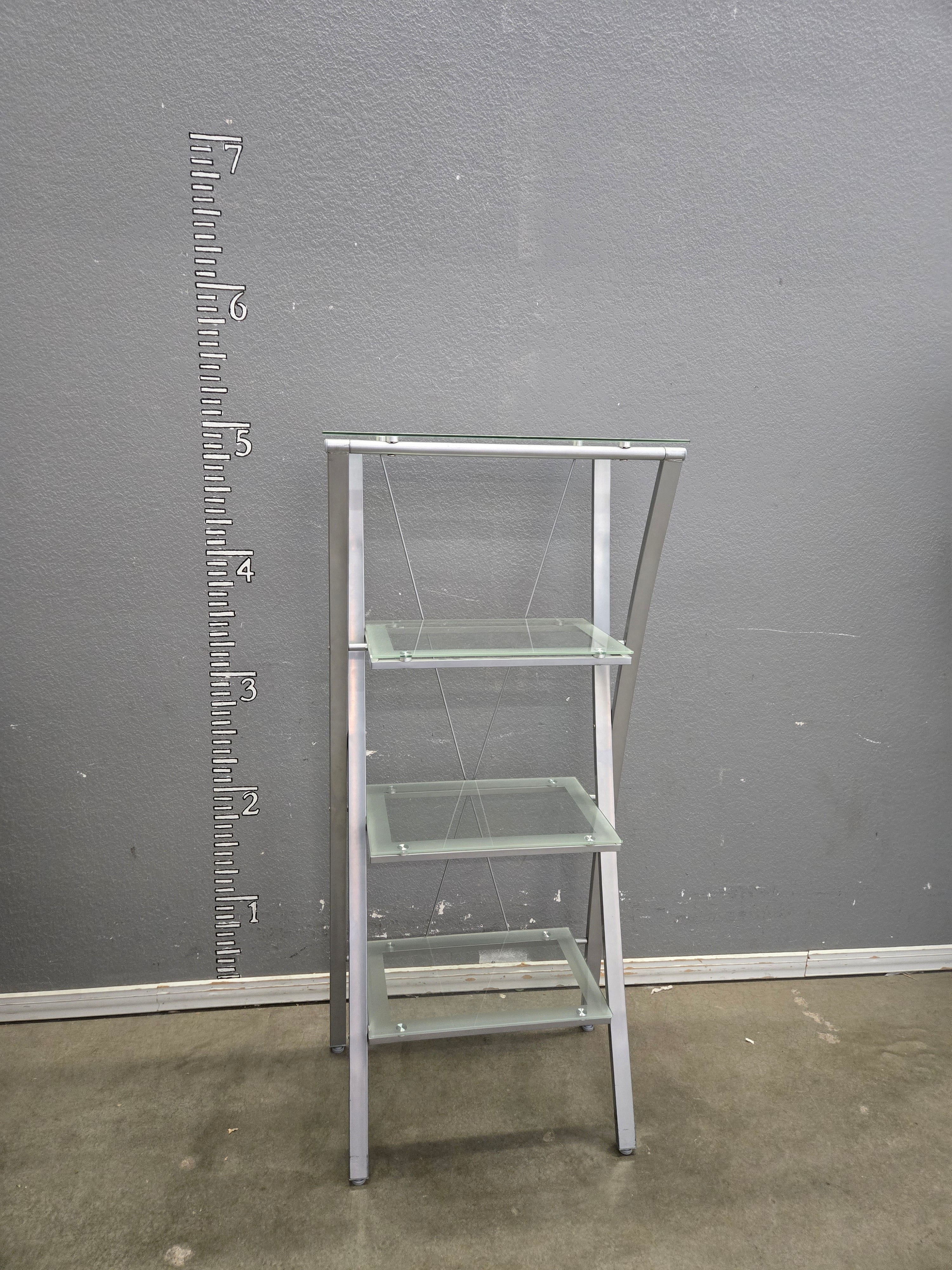This sleek shelf unit features three tempered glass shelves with a frosted finish and a silver metal frame. Perfect for showcasing decor in a contemporary space. Approximate Size: 5 x 2 x 1