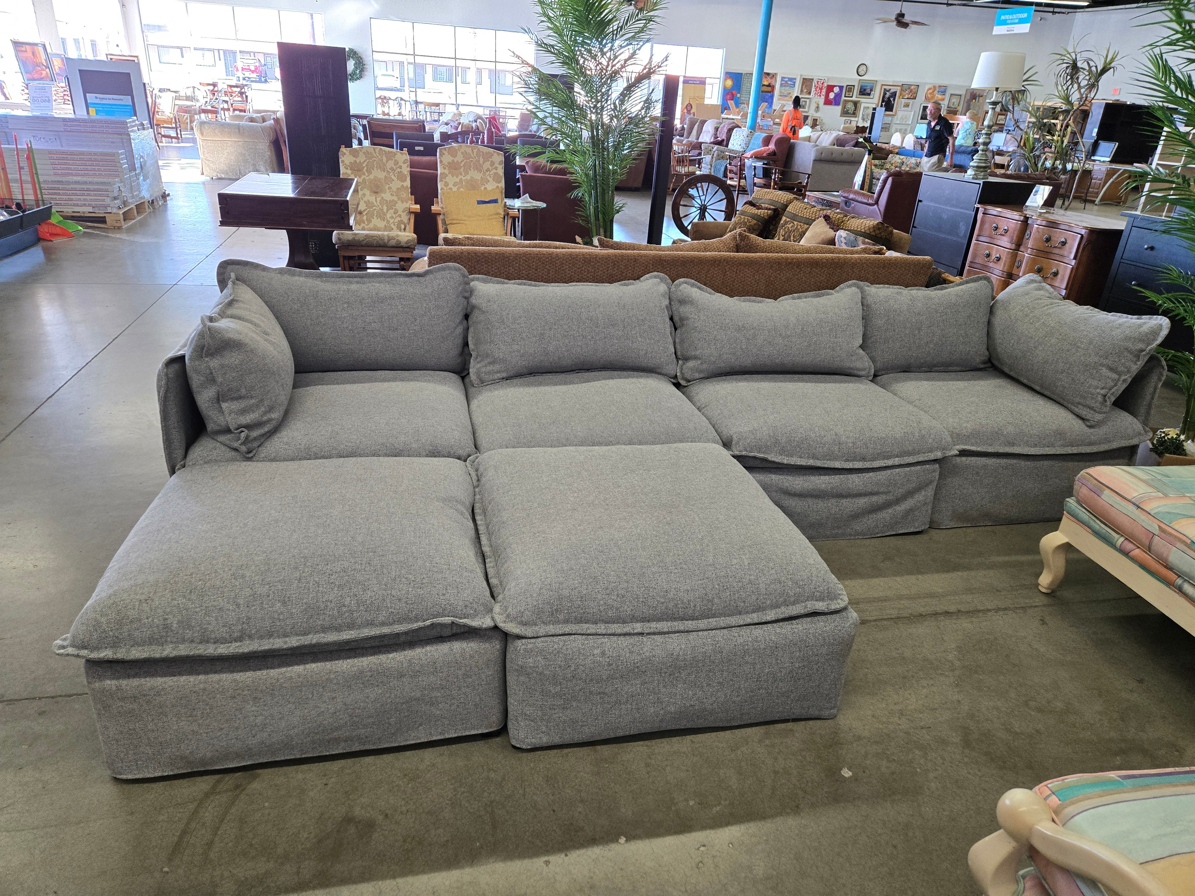 This stylish sectional sofa features a modern design with plush gray fabric and a soft, inviting finish. It offers comfortable seating with its generously padded cushions and modular configuration. Approximate Size: 2.5 x 10 x 6
