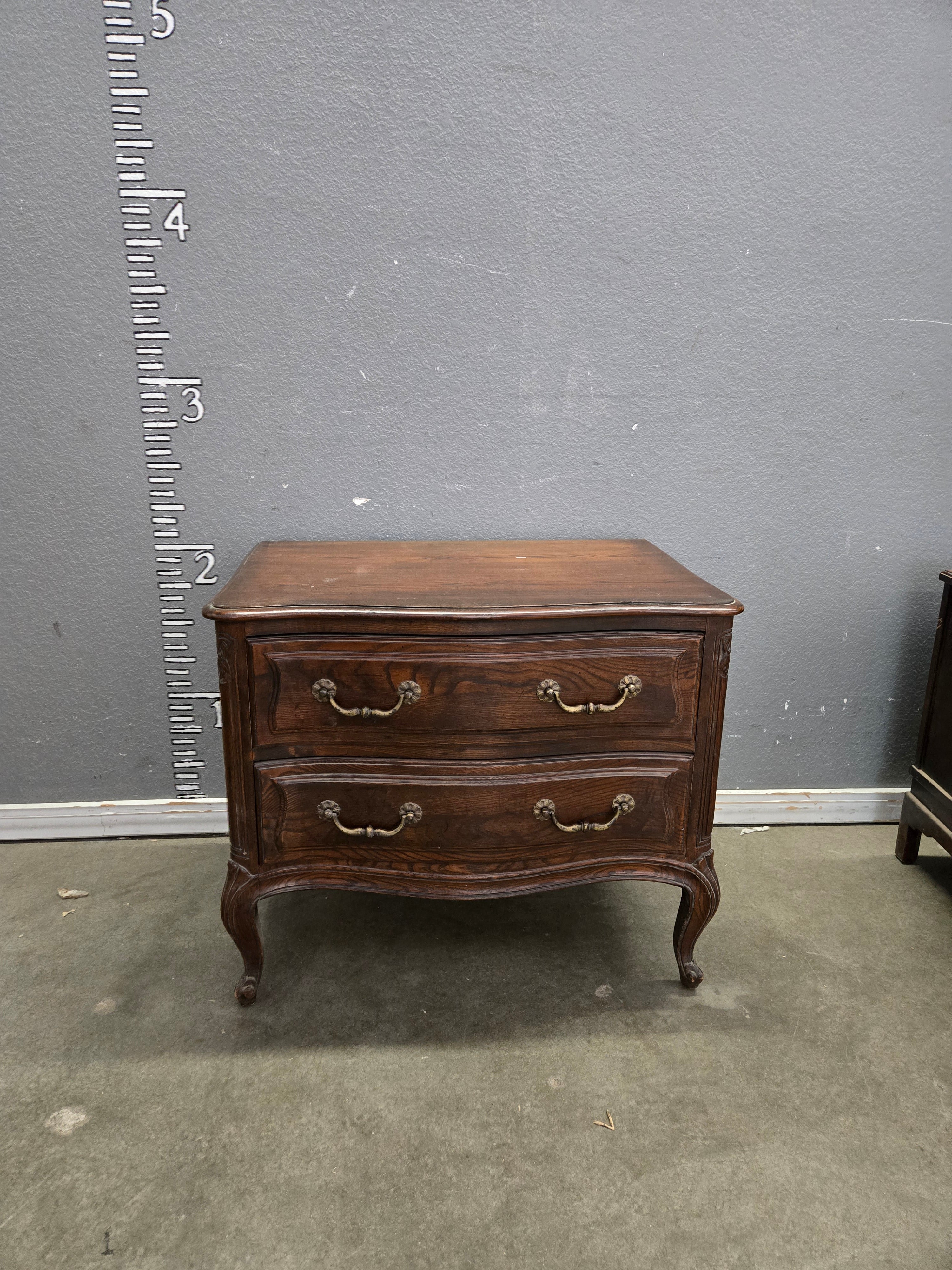 This vintage nightstand features a rich dark brown wood finish with elegant curved legs and brass handles. Ideal for complementing any bedroom décor. Approximate Size: 2.5 x 2 x 1.5